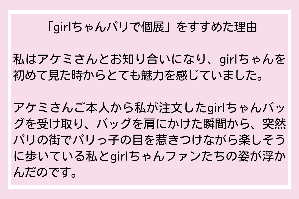 もともと、girlちゃんを知ってもらった方からは「girlちゃんはヨーロッパが似合う」「パリで個展を開催すればいいのに」というお声をたくさんいただいていました。私自身もいつかはパリで個展が開催できればいいなと思っていました。
