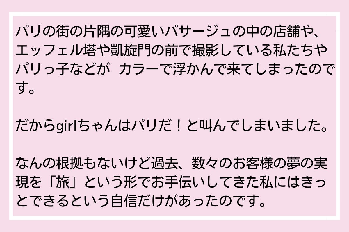 自分の夢実現をgirlちゃんに重ね合わせて応援してくれる仲間がいるから、できるのです。その仲間への感謝の気持ちと勇気を持って、パリ行きを実現させます!