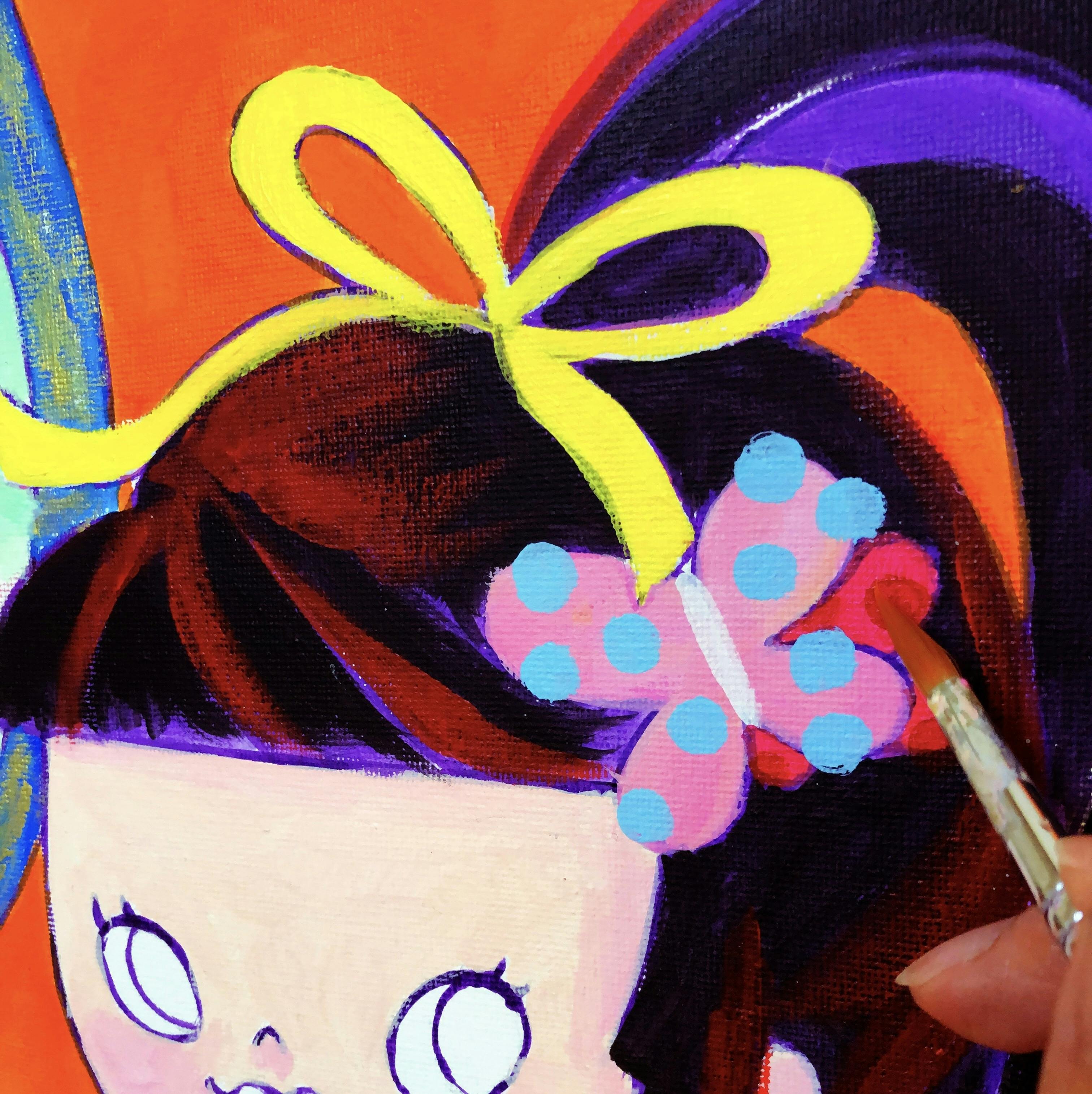 2012年に心からの情熱に繋がる絵としての"girlちゃん"を見出し、描き始めました。2013年からは毎年日本でgirlちゃんを主軸にした個展を開催しています。girlちゃんのグッズ展開も始めました。