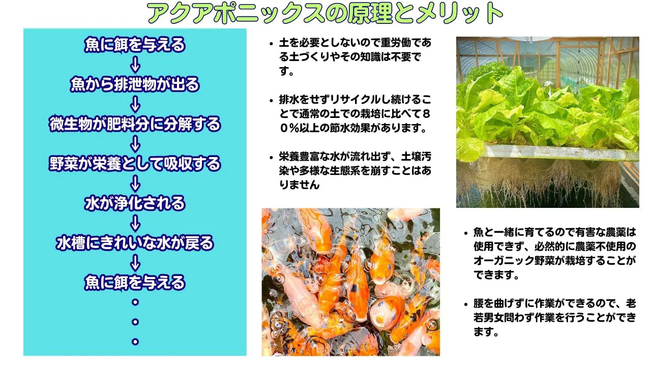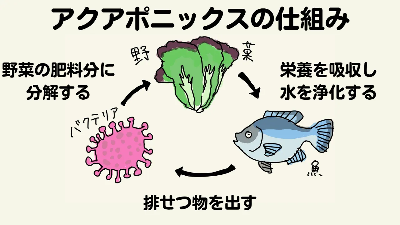それに対して、アクアポニックスでは野菜と同じ施設内で飼育される魚の排泄物が循環利用されるので輸送コストがかかりません。