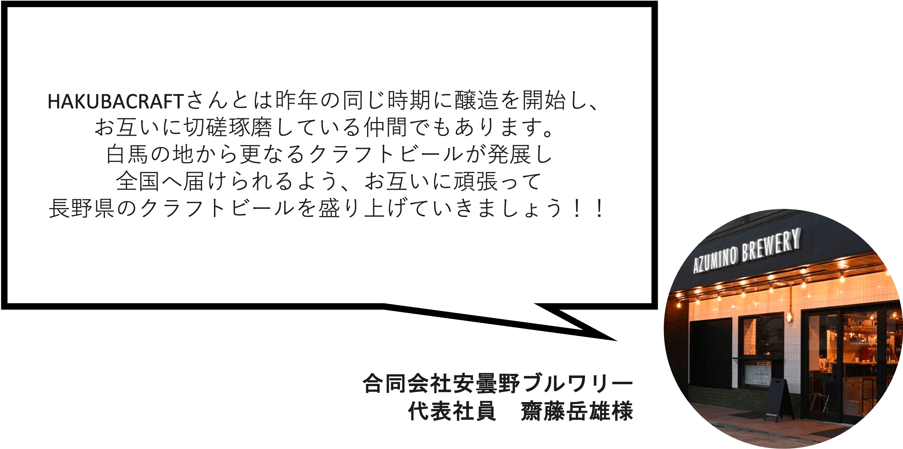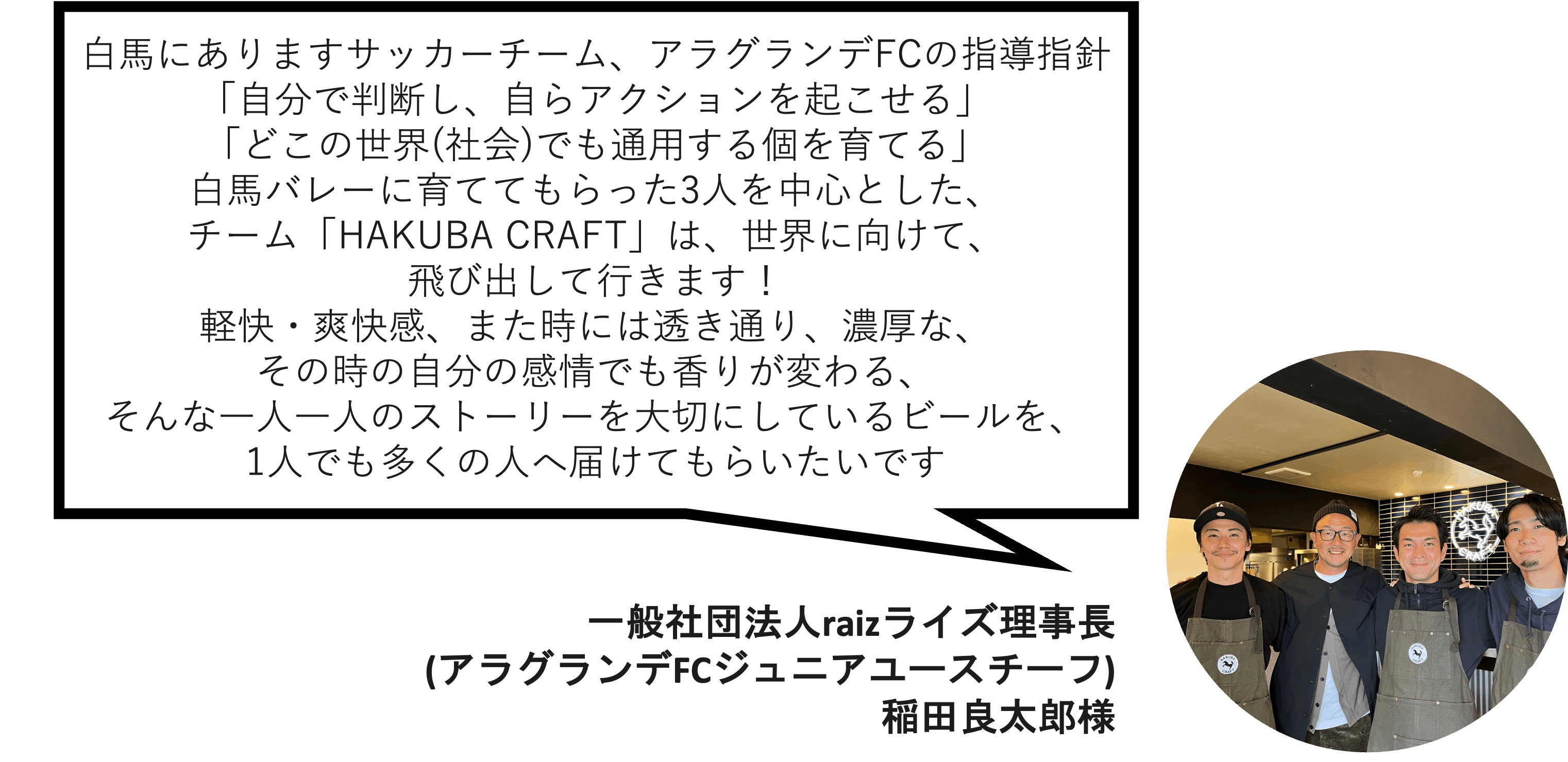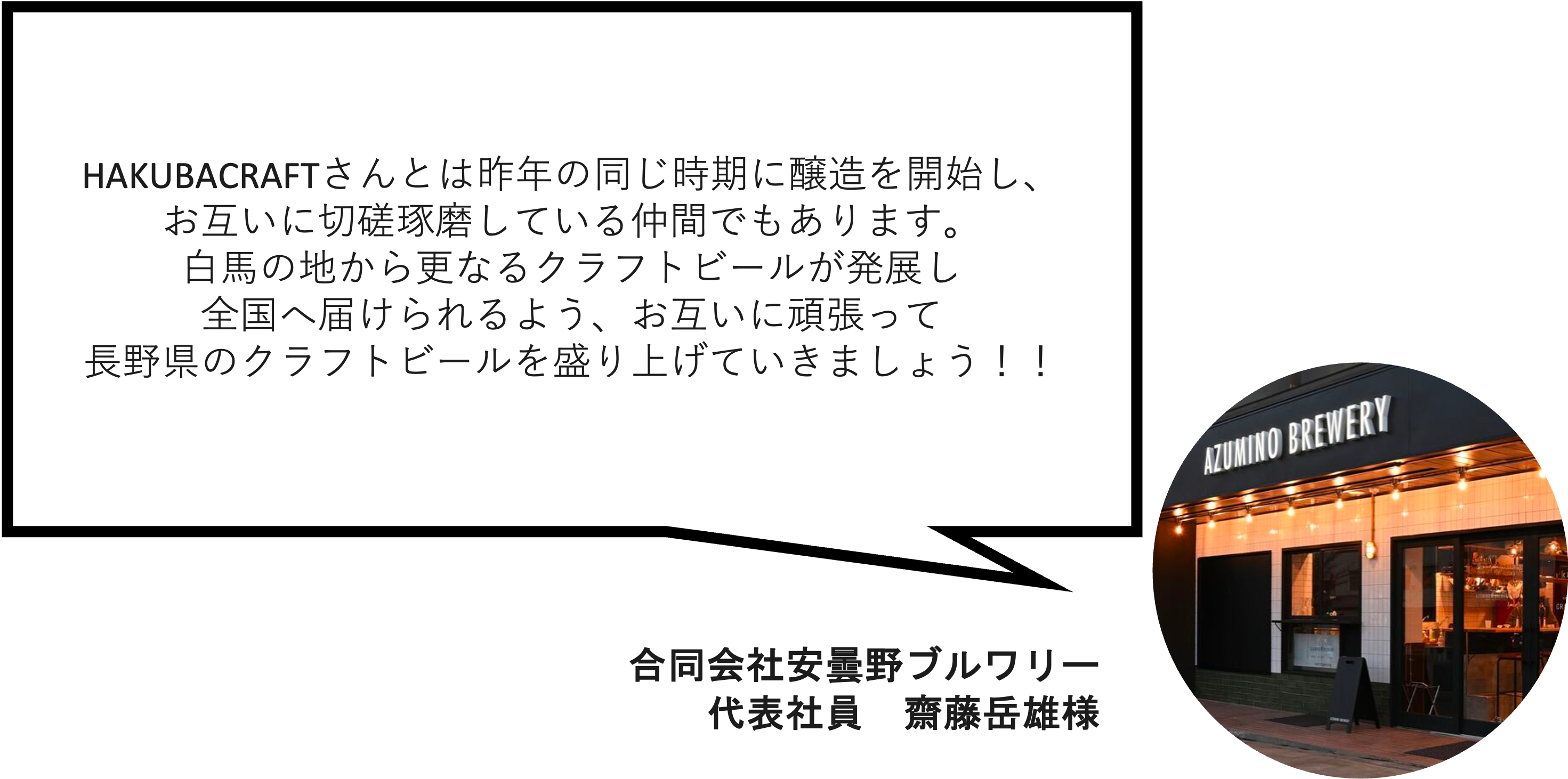 “白馬バレー”(以下:白馬)の新しい魅力となるクラフトビールを生産して、クラフトビールをきっかけに、白馬を知ってもらい、訪れてもらい、満喫してもらう。(住んでもらう)そして、何度も訪れたくなるような、自身の故郷と感じてもらいたい。そんな、人々にとって愛着のある場所になっていくことの一助を担うことを目指しています。