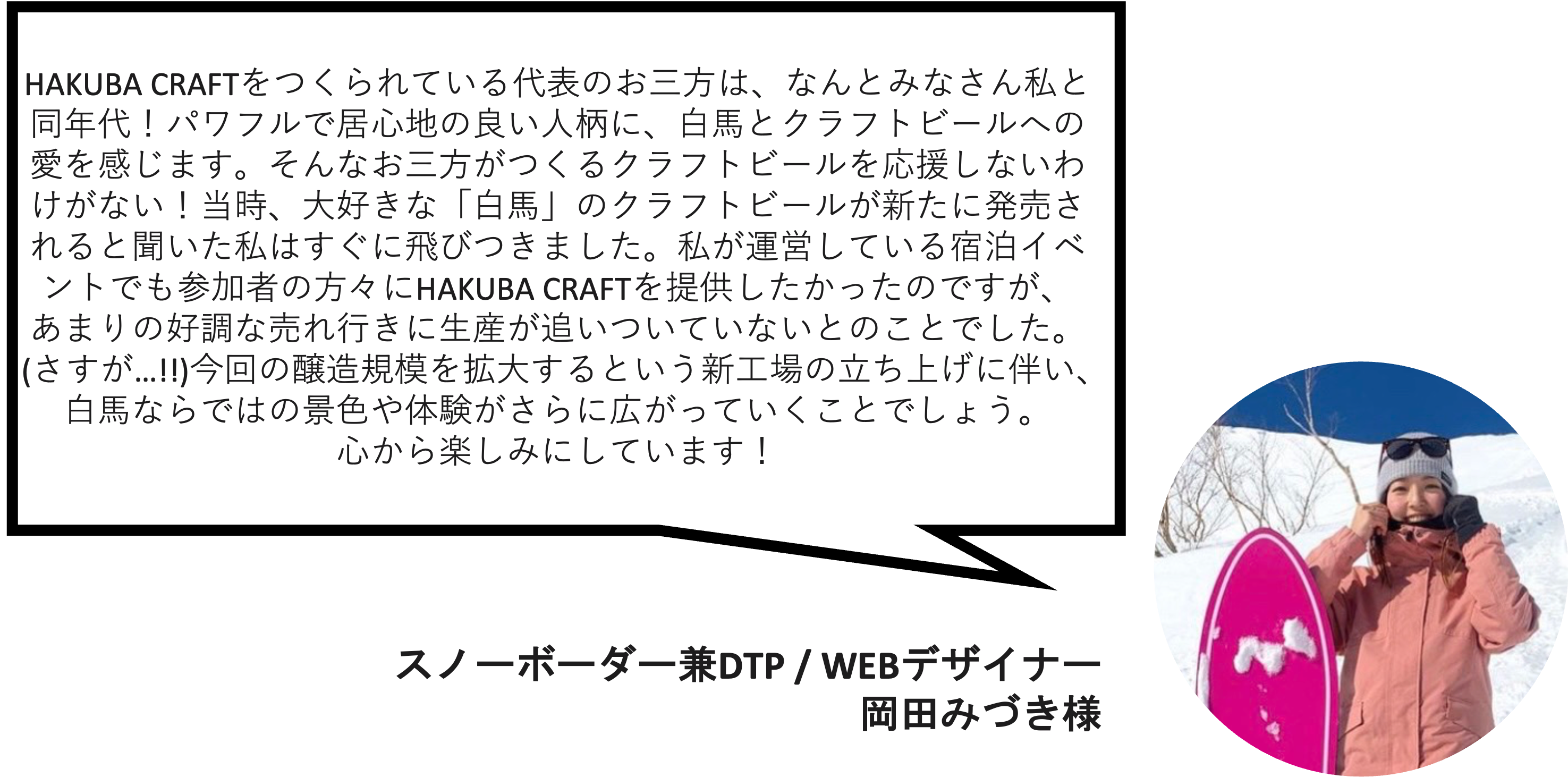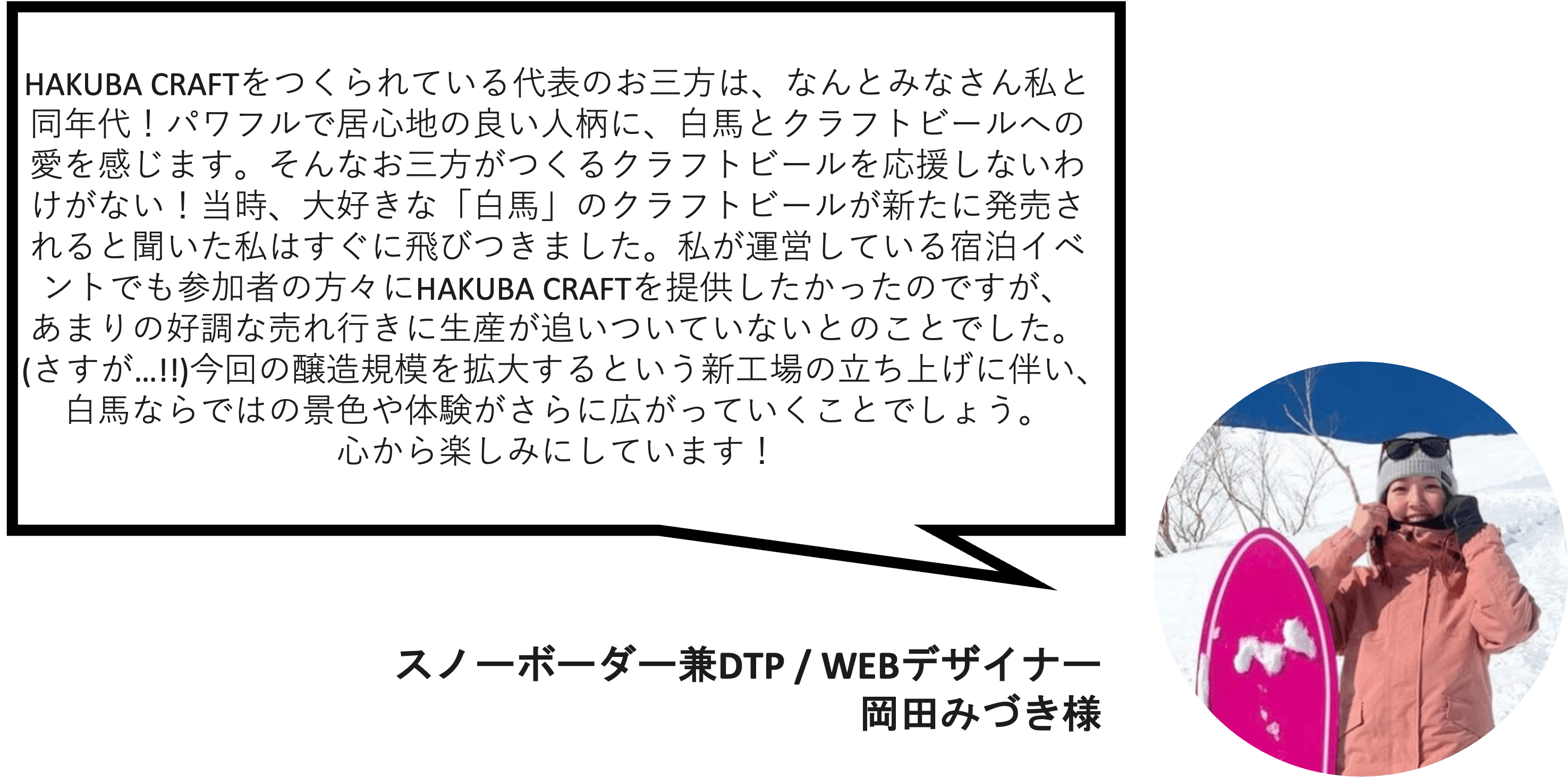 そして私たちは決意しました。まずは楽しみにしていただいているお客様への安定供給をお約束するために生産能力を高めます。さらに、全国・世界中の人々が“HAKUBA CRAFT”を手に取り“白馬”を知ってもらうために生産能力を高めます。