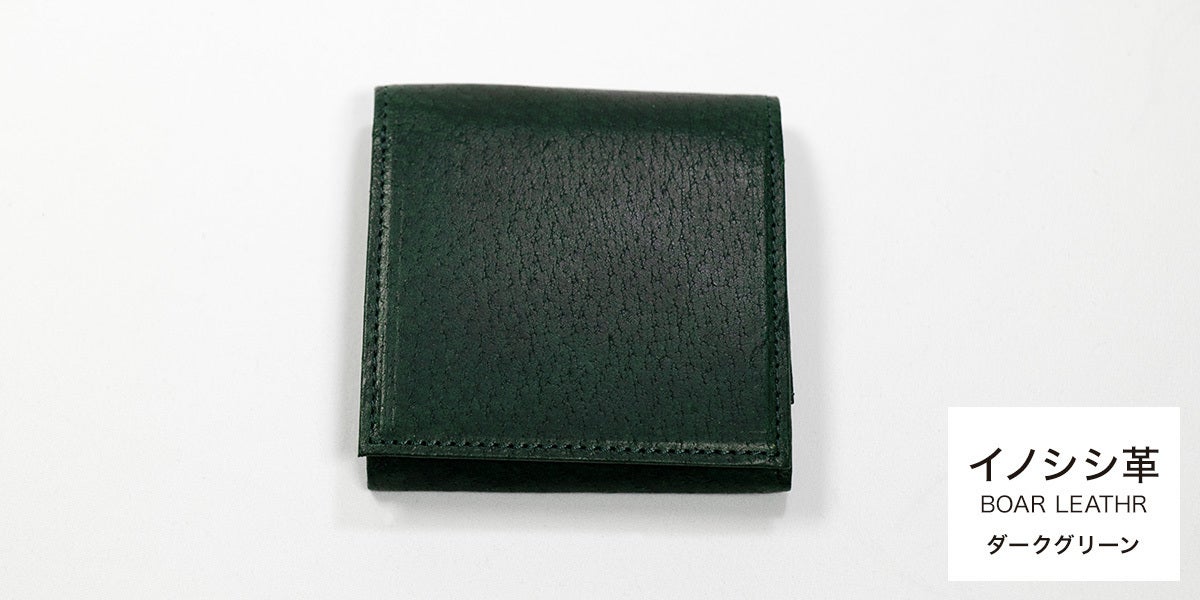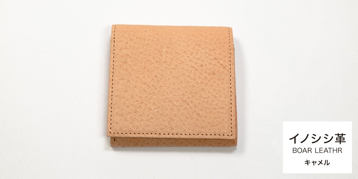 材質:イノシシ革(日本産 フルタンニン加工・防水加工)、牛革(コインポケットのフラップ両脇ささえパーツのみ)、綿布、紙製芯材、金属パーツ(ホック)