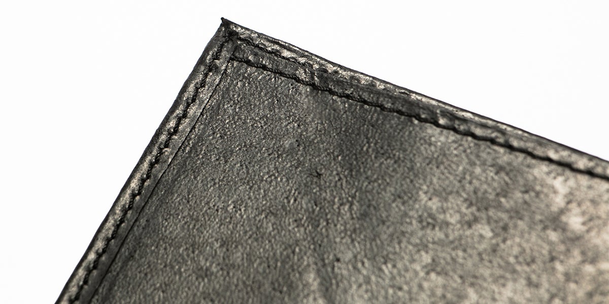 周辺はヘリ返しの技術で作っていますが、これは0.2~0.3mmまで薄く漉かないと実現できません。芯材が入る部分は厚みを変えて漉き、裏地をつけるなど目に見えないところを工夫して薄さと耐久性を両立しています。」