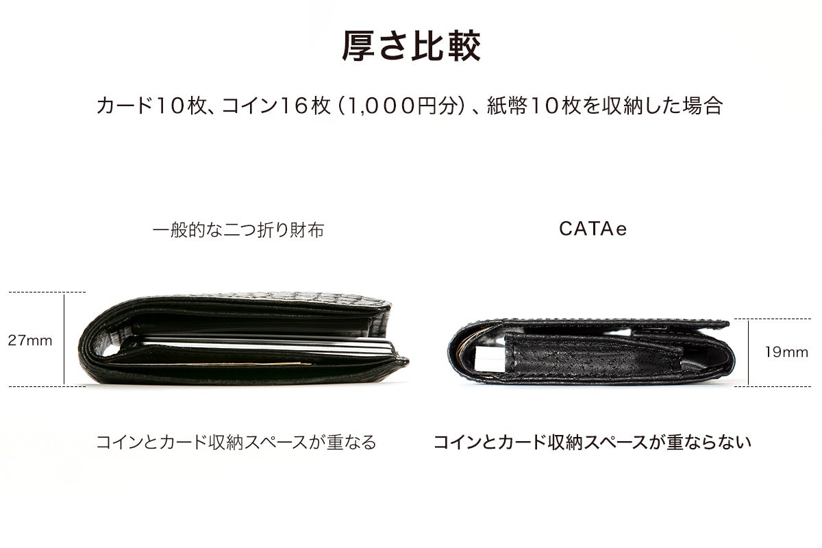 CATAe(カタエ)の構造は、従来の財布とは全く違います。カードを減らすとコインの収納量が増える新構造で使用しないスペースを極力無くし、限られた空間を最大限に活用します。下のイラスト財布断面図を参照。