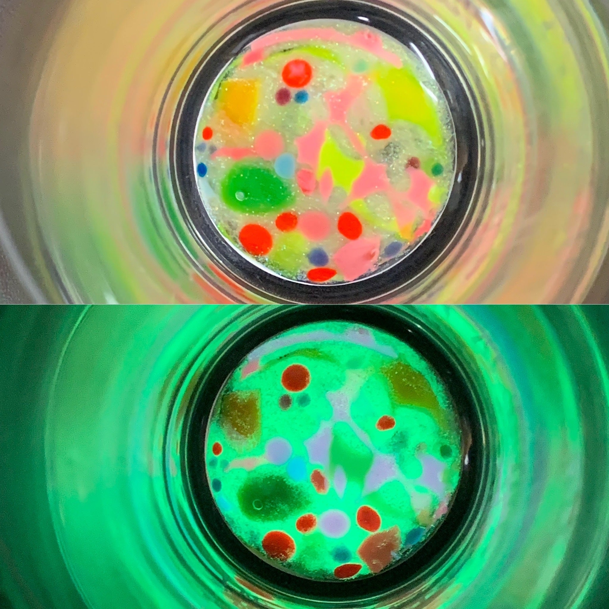 グラス底面の蓄光部分には、近年のSDGsの取り組みから、月光工房で月光グラスを製造する際に発生する、蓄光廃材を混ぜ込んでおります。それにより様々な色の蓄光材が混ざりPOPなデザインとなっております。