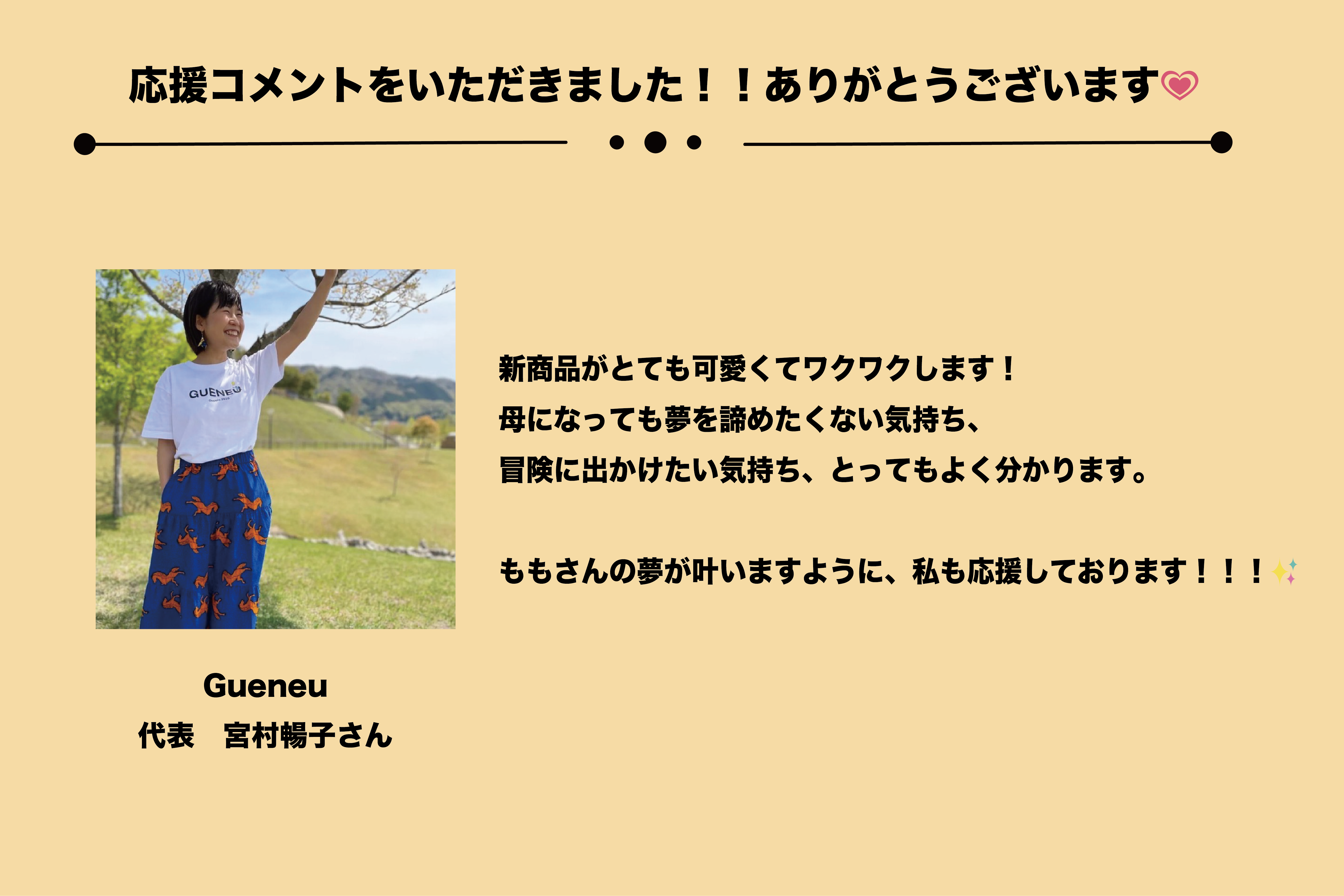 今回のクラウドファンディングを行うにあたり、応援コメントをいただきました。みなさん、今の私を作り上げてくださった皆様です。お名前は団体名、ブランド名などをクリックしていただくと、みなさんのSNSやHPなどへ飛ぶことができます!!