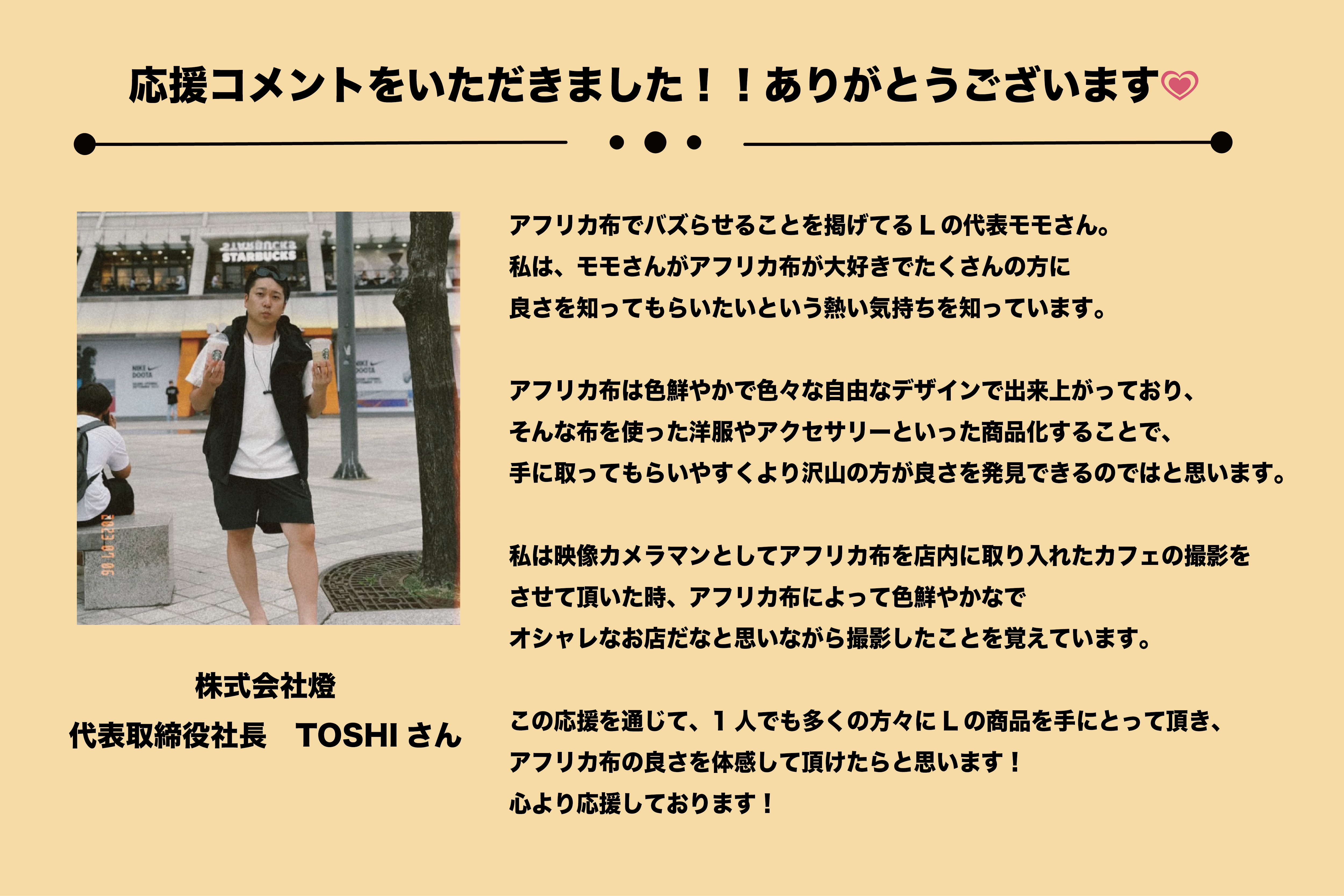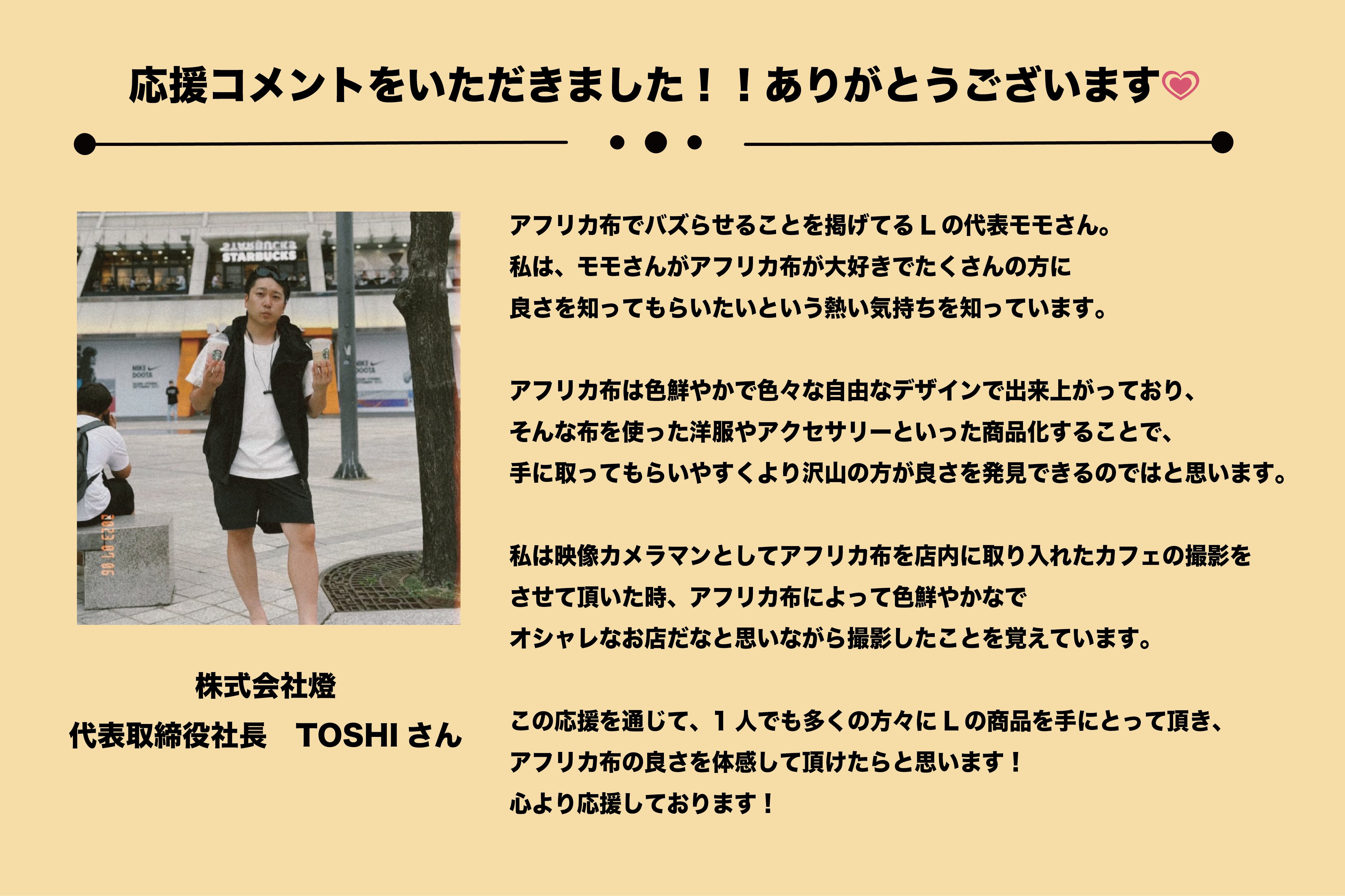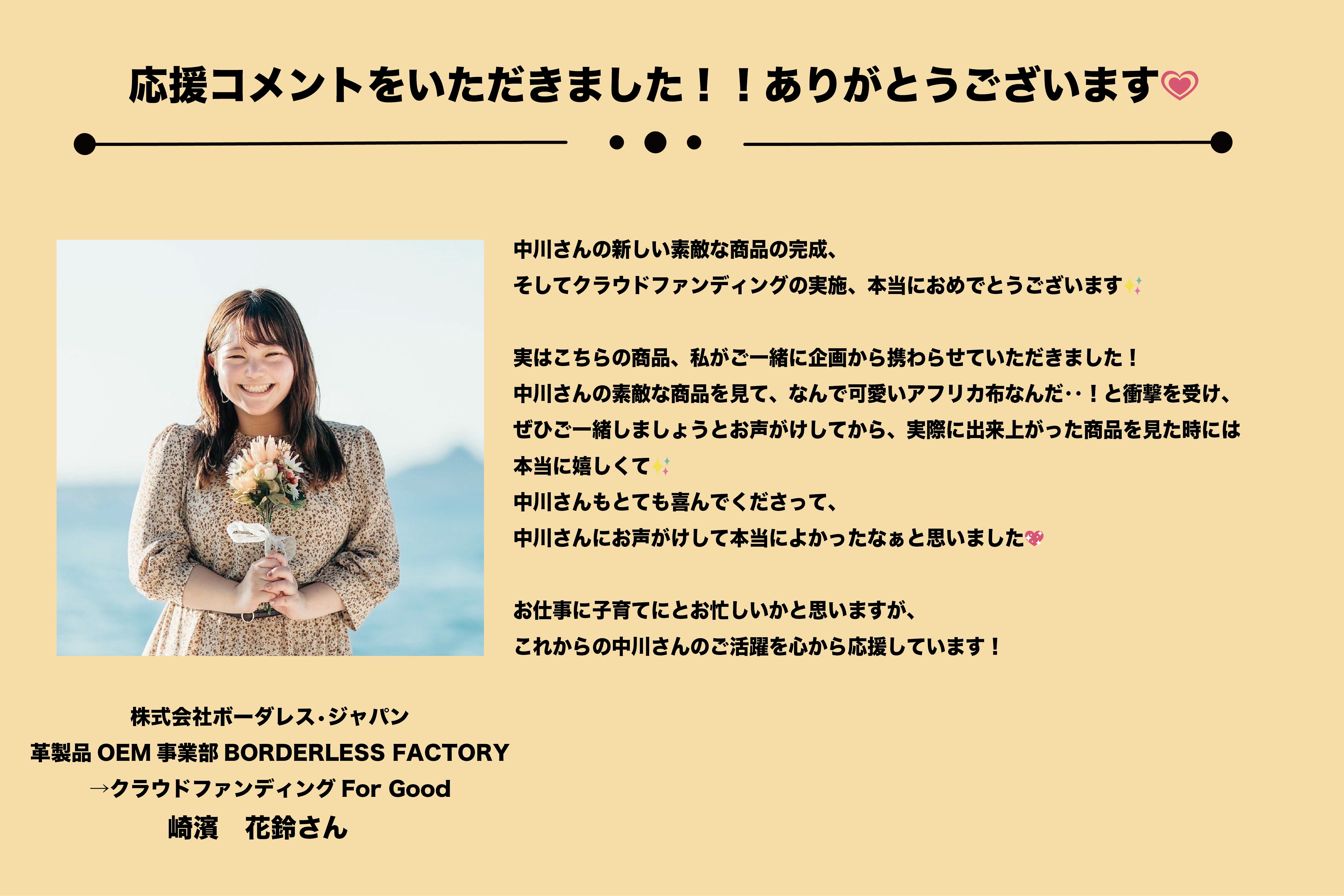 2024/02/02 17:47【資金の使い道について】平素より名古屋のアフリカ布ブランド〝L〟をお引き立て頂き誠にありがとうございます。代表の中川ももです。私共は、現在西アフリカ生まれのWoodin社のみのアフリカンプリント(アフリカ布)を使用し商品作りをしております。そして今後、ブランドを更に大きくし今より多くの方にアフリカ布を知っていただくためには、まずメーカーから正規取引をし直接仕入れをすることを決断いたしました。ここからが本題なのですが、この費用は、クラウドファンディングで皆様から頂いた資金でお支払いさせて頂きました。プロジェクトの目的は、『【24歳の挑戦!】人生を180度変えられた「アフリカ布」を日本にもっと広めたい!』というものでしたが、ページ内に具体的な今後の資金の使用方法を書かせていただいておりました。それらを現在は行っていないことから、あの時の宣言は無くなってしまったのだろうか?という思いをされる方がいるのではないかと思いました。私たちは、それらを「今後行わない」ということではなく、それらを遂行するために『まずは』仕入れを優先させていただいたという流れです。ブランド運営の中で、「有言実行していく難しさ」を感じております。ただ、一度宣言したことはできる限りの力を使って求め続け、それでも難しかったらキッパリと諦めて更にいい道を探す。これを大切にしていきたいと考えています。ですが、今回に関しては皆様の思いをもとに頂いた資金ですので、個人的な思いでこのような文章を書かせていただいております。そしてアフリカ行きに関してですが、アフリカ渡航のために当初の予定より更に多い金額の100万円をセカンドゴールとして設定させていただきましたが、このゴールは未達成だったため、今後のブランド活動などの資金をもとに渡航したいと思っております。最後になりますが、クラウドファンディングは資金が集まって終わりではなく、その頂いた資金は皆様からの期待や思いであると考えます。ですので私自身は、「お預かりしたお金』だと位置付けております。このお預かりしたお金を皆様がもっとワクワクしてもらえるような喜びに変え、皆様にお届けしたいと思っています。今後とも、名古屋のアフリカ布ブランド〝L〟を宜しくお願い致します。代表 中川ももスタッフ一同 もっと見るもう一つだけ甘えさせてください!