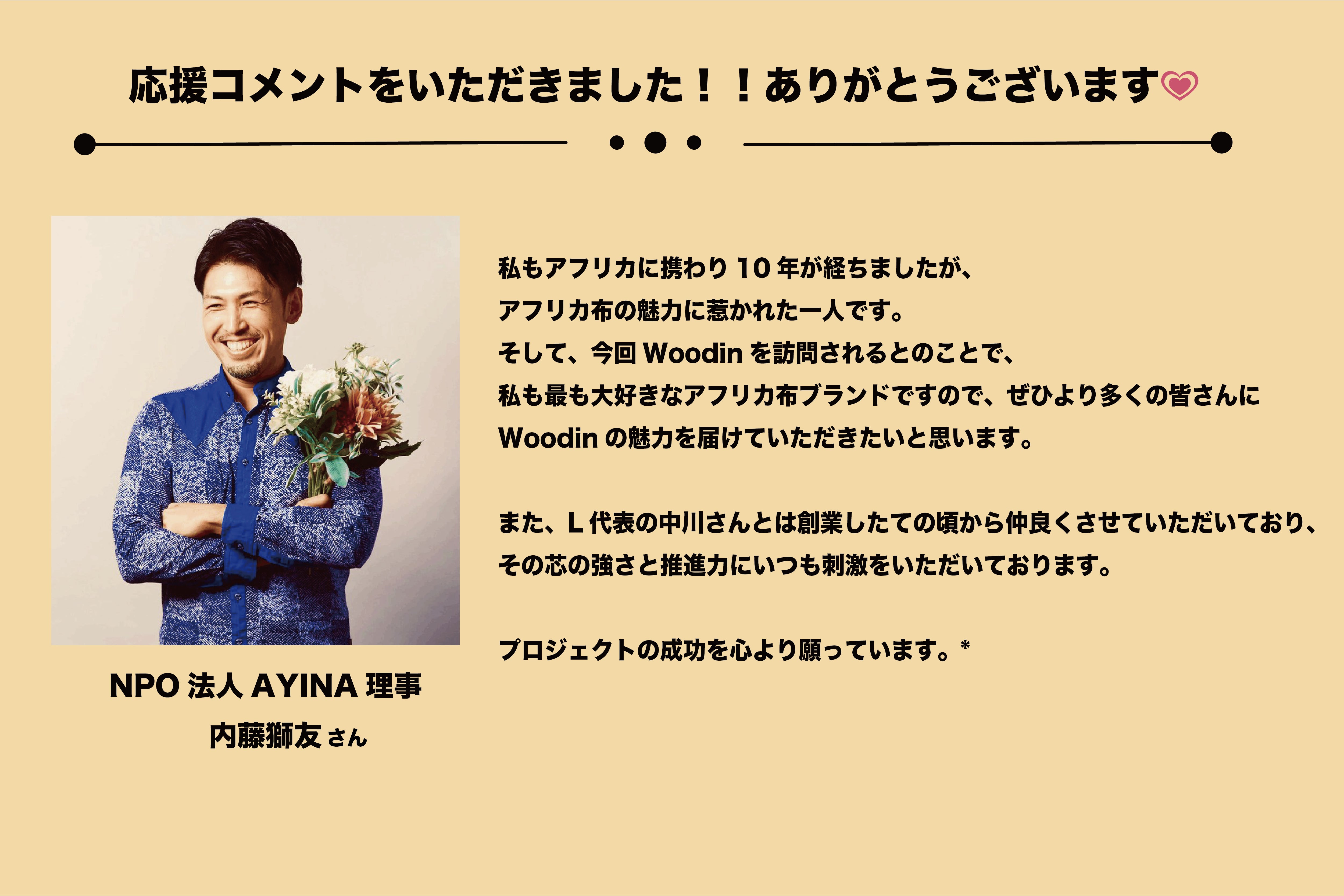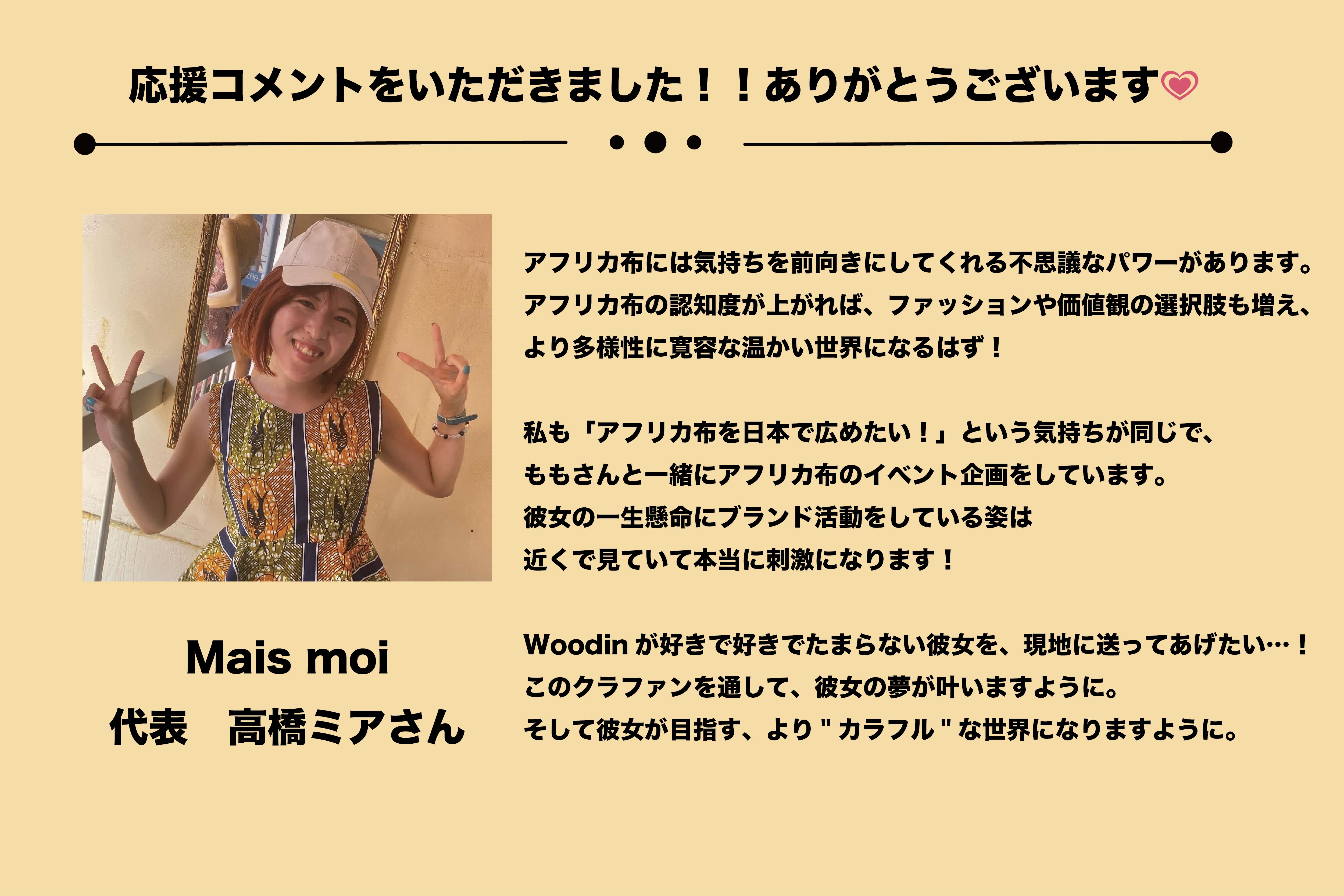売上を作り、大好きなアフリカ布ブランドWoodinのお店に行くために、アフリカに行きたい!実際に肌で感じ、自分の目で見て、お客様にもっともっと素晴らしい商品をお届けできる代表になりたい!!!