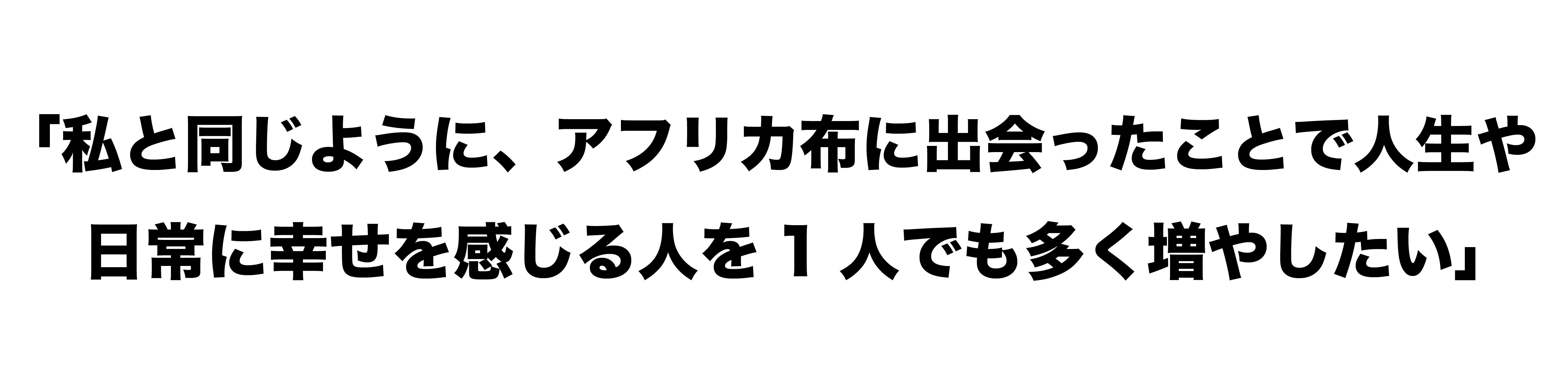 私は、アフリカ布に出会ったおかげで人生が幸せになりました。日常が変わりました。私は大きく人生が変わりましたが大きさは関係なく、このように日常にアフリカ布が少しでも存在して、幸せを感じていただける人を一人でも多く増やしたい。だから、広めたいんだと。