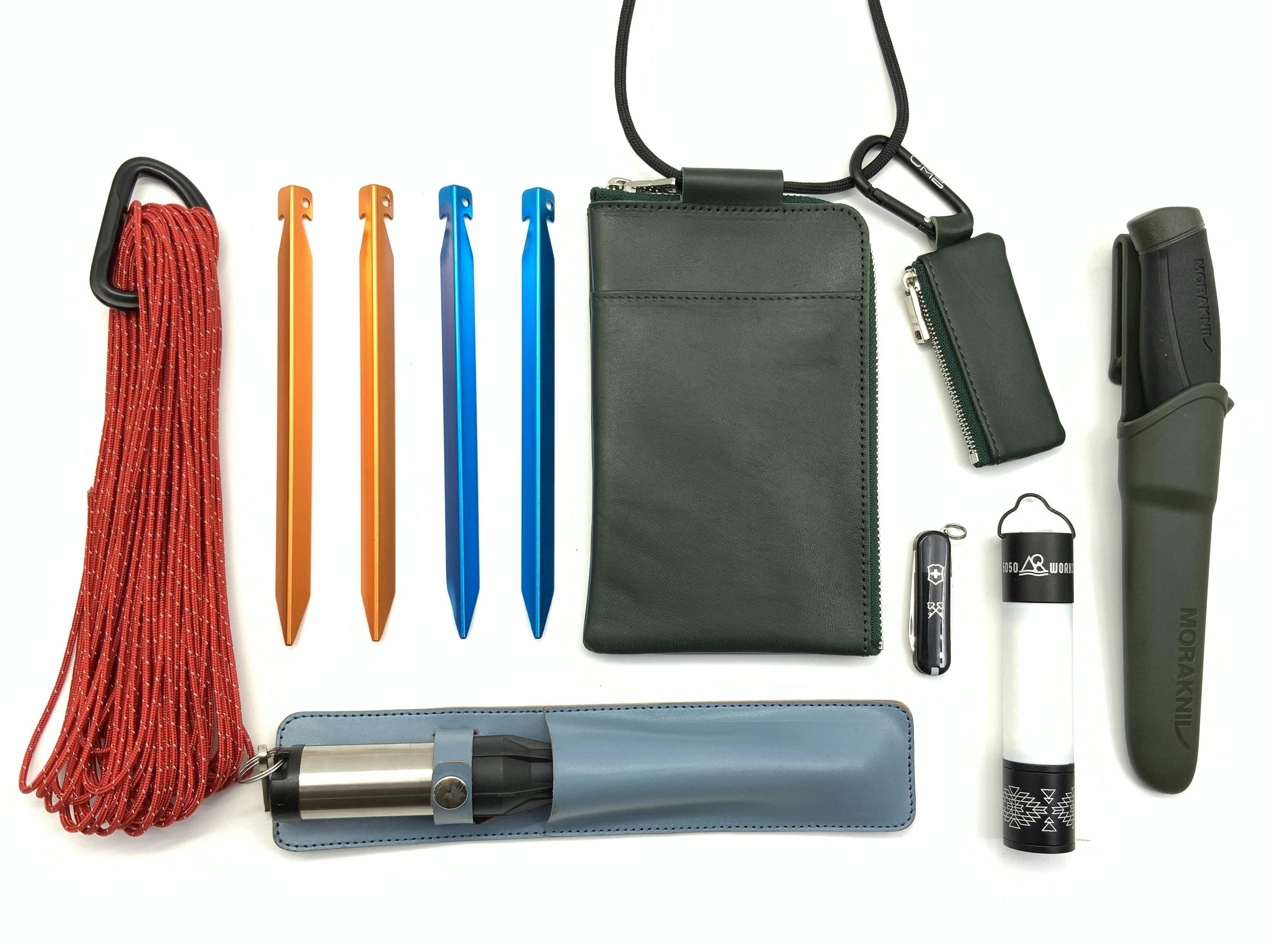 キャンプでは、ペグ、ナイフ、ライト等、バラバラになりがちな必需品をひとつにまとめることができます。