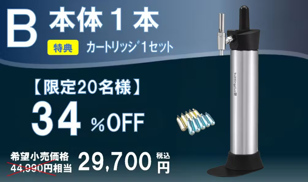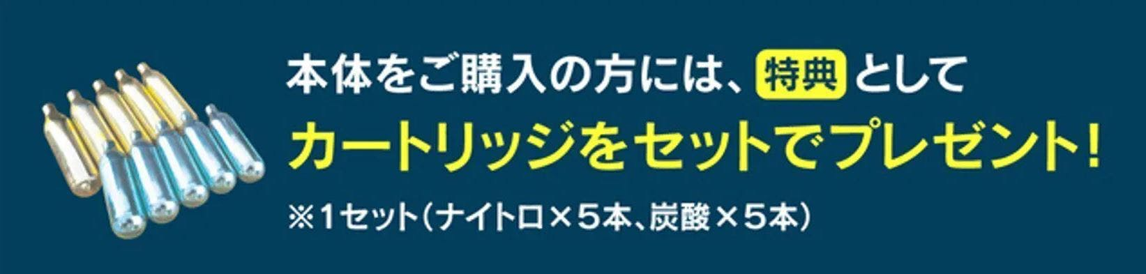 ■ 今回だけのお得な特典! 本商品は別売りのガスカートリッジが必要となっておりますが、今回に限り商品到着後すぐに使用していただけるよう、特別にCO₂(炭酸)N₂(窒素) のカートリッジをセットにいたします。※カートリッジ本数はリターン毎に異なります。