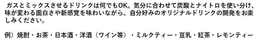 一般的に普段飲まれているドリンクであれば使用可能です。限定的でないところもこの商品の強みですので、是非ともいろいろなドリンクを窒素や二酸化炭素と組み合わせて新たなオリジナルドリンクを開発してみることをオススメ致します。