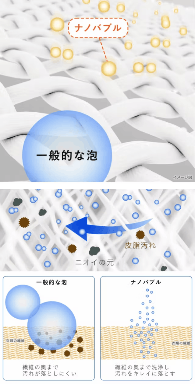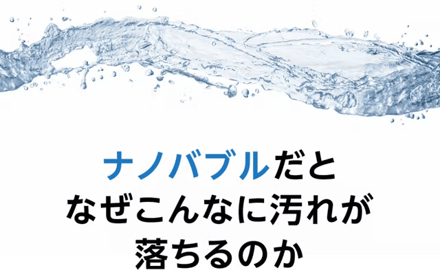 ナノバブルは一般的な泡と大きさが違い、極小の泡が繊維の奥まで入って汚れを落とす事ができます。
