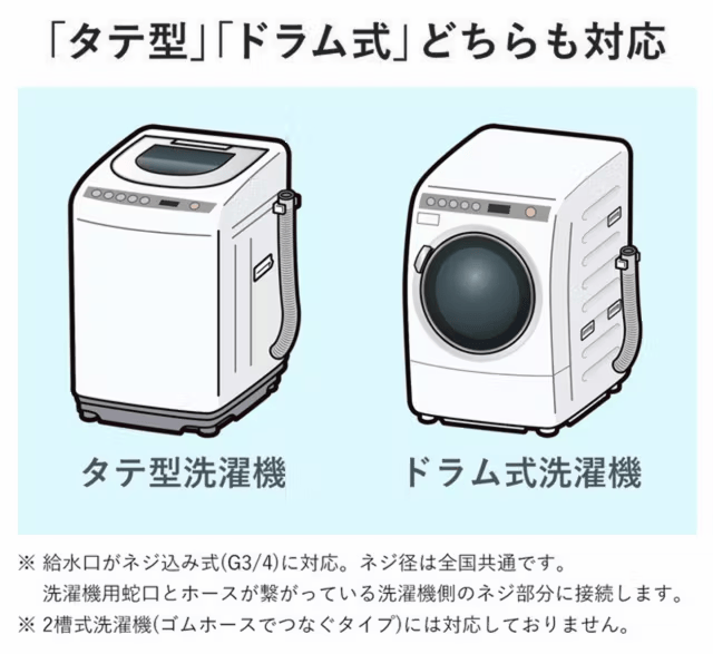 A.二槽式洗濯機には取り付けができません。また、海外メーカーなど給水口ネジ径がG3/4ではない洗濯機には取り付けができません。