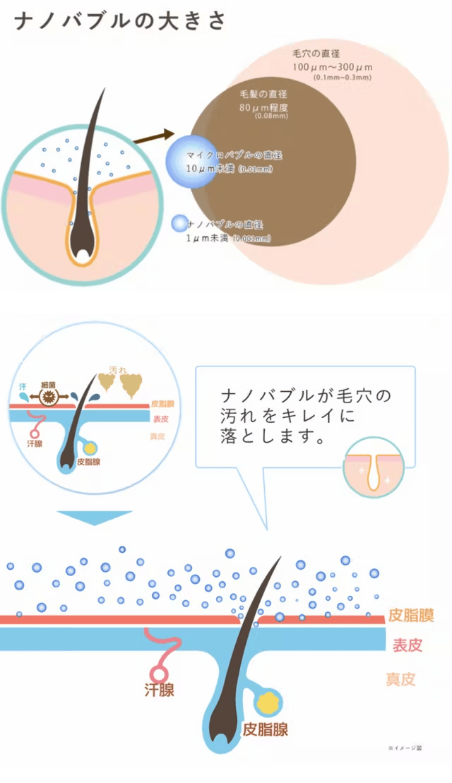 ナノバブルは毛穴の直径よりも非常に小さいサイズになるため、毛穴の奥まで入り込んで汚れを落とし、毛穴を洗浄します。