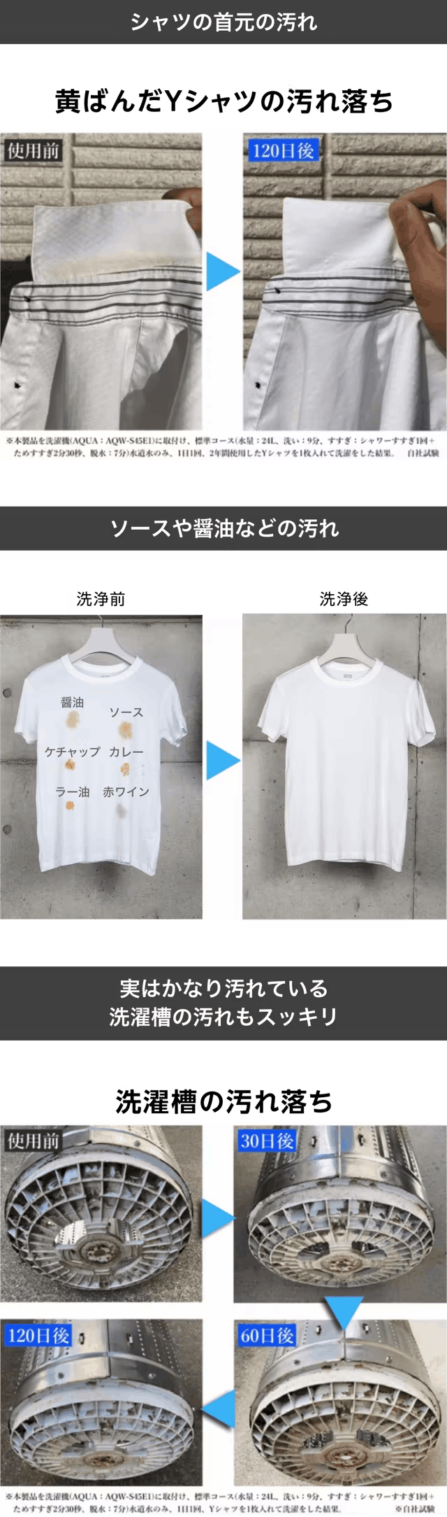 ※本製品を洗濯機(AQUA:AQW-S45E1)に取り付け、汚れを付着させてから15分間放置後に標準コース(水量:24L、洗い:9分、すすぎ:シャワーすすぎ1回+ためすすぎ2分30秒、脱水:7分)水道水のみ、1日1回Yシャツを一枚入れて洗濯をした結果。 ※自社試験
