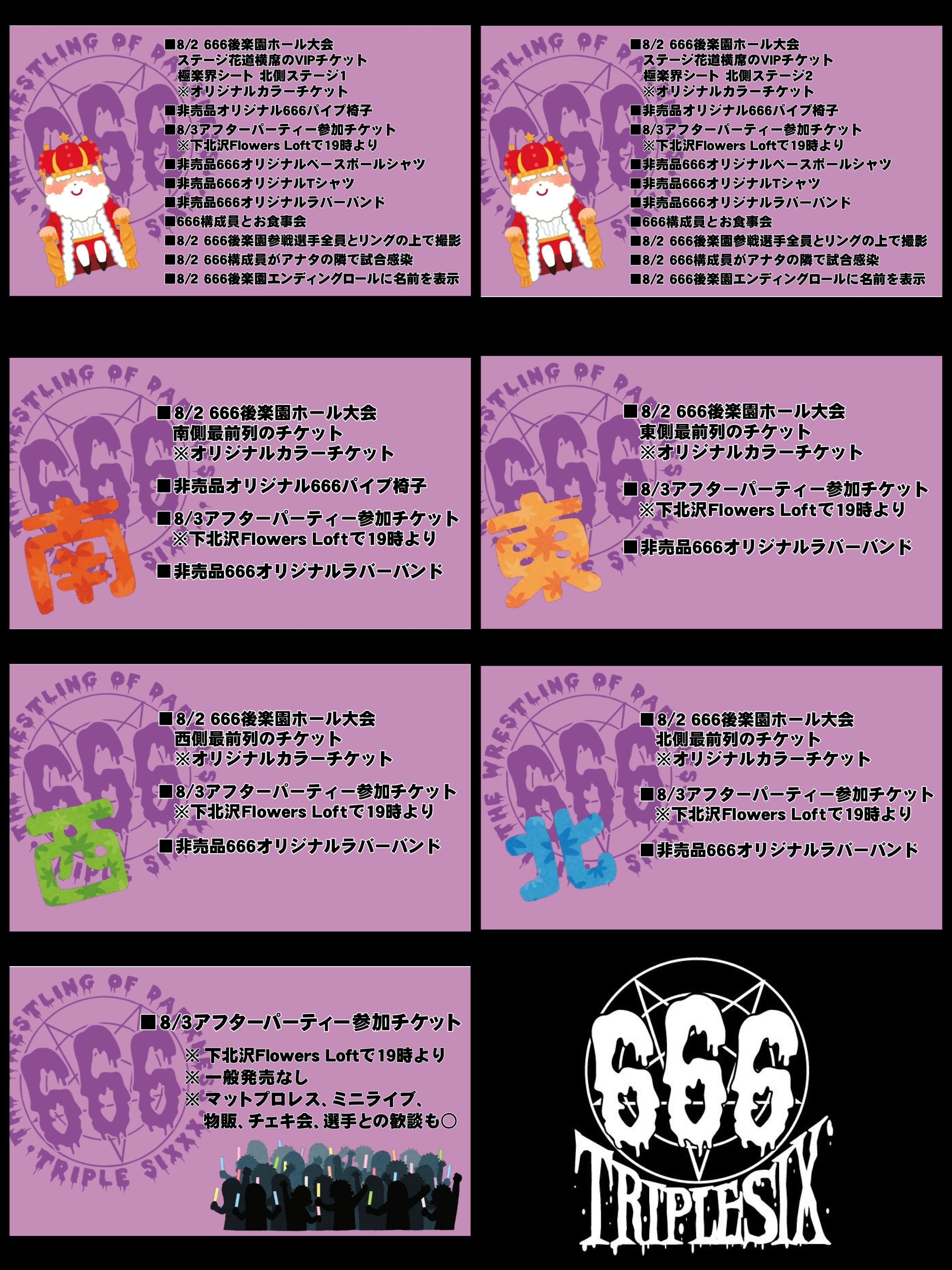 2023年8月2日の666後楽園大会の極楽界シート(超絶特典付きVIP)、天上界シート(豪華特典付き南側一列目)、人間界シート(特典付き東西北一列目)と