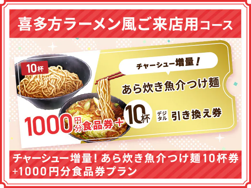⑨【ご来店用】チャーシュー増量!あら炊き魚介つけ麺10杯券+1,000円分食品券分得得プラン