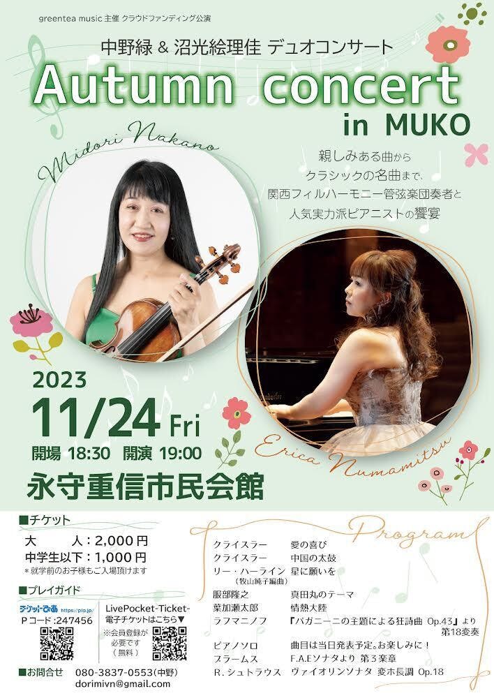 この度向日市に永守重信市民会館が建てられたことを大変嬉しく思います。子供達や市民の皆様に気軽に聴いていただけるようなバイオリンとピアノのコンサートを開催したいと思っています。日程:2023年11月24日 (金)会場:永守重信市民会館ホール入場料:大人2,000円 小人1,000円