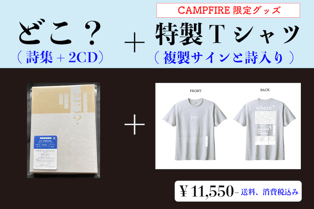 複製サインと"どこ"の詩がデザインされたオリジナルTシャツ+『どこ?』(詩集+2CD)のセットです。