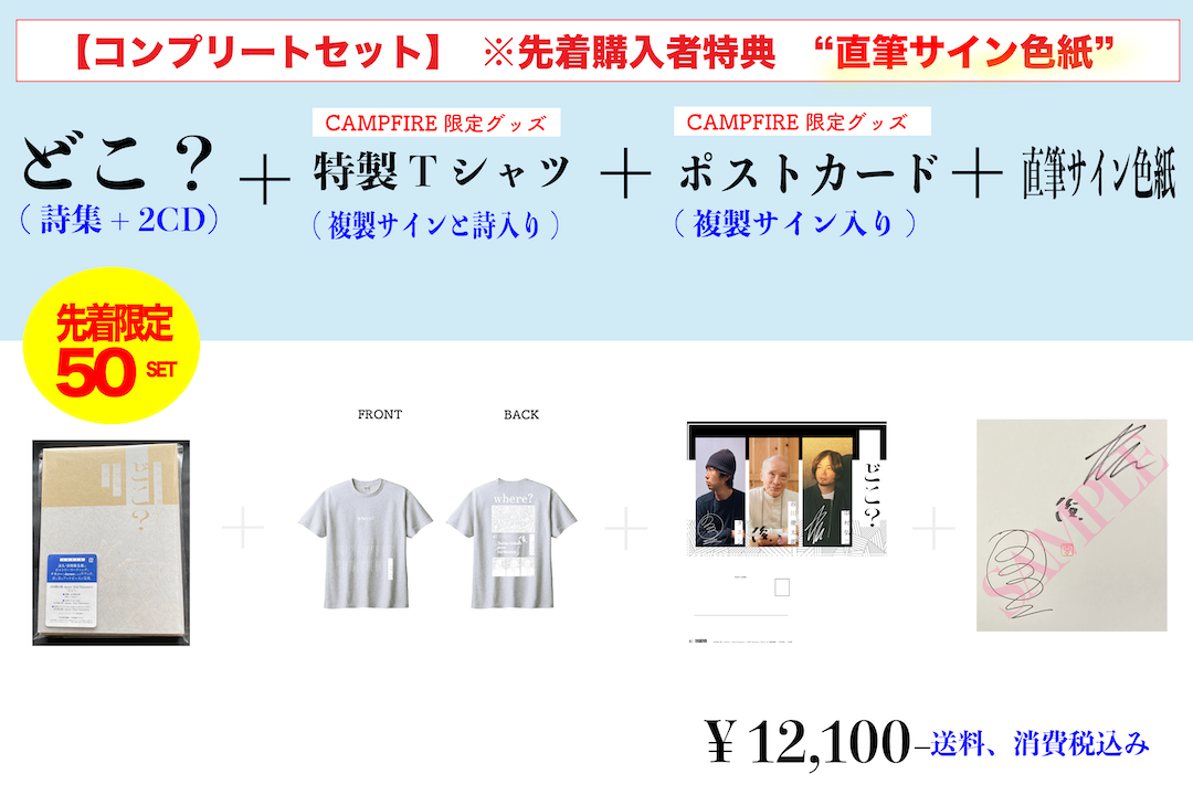複製サイン入りのポストカード+『どこ?』(詩集+2CD)のセットです。
