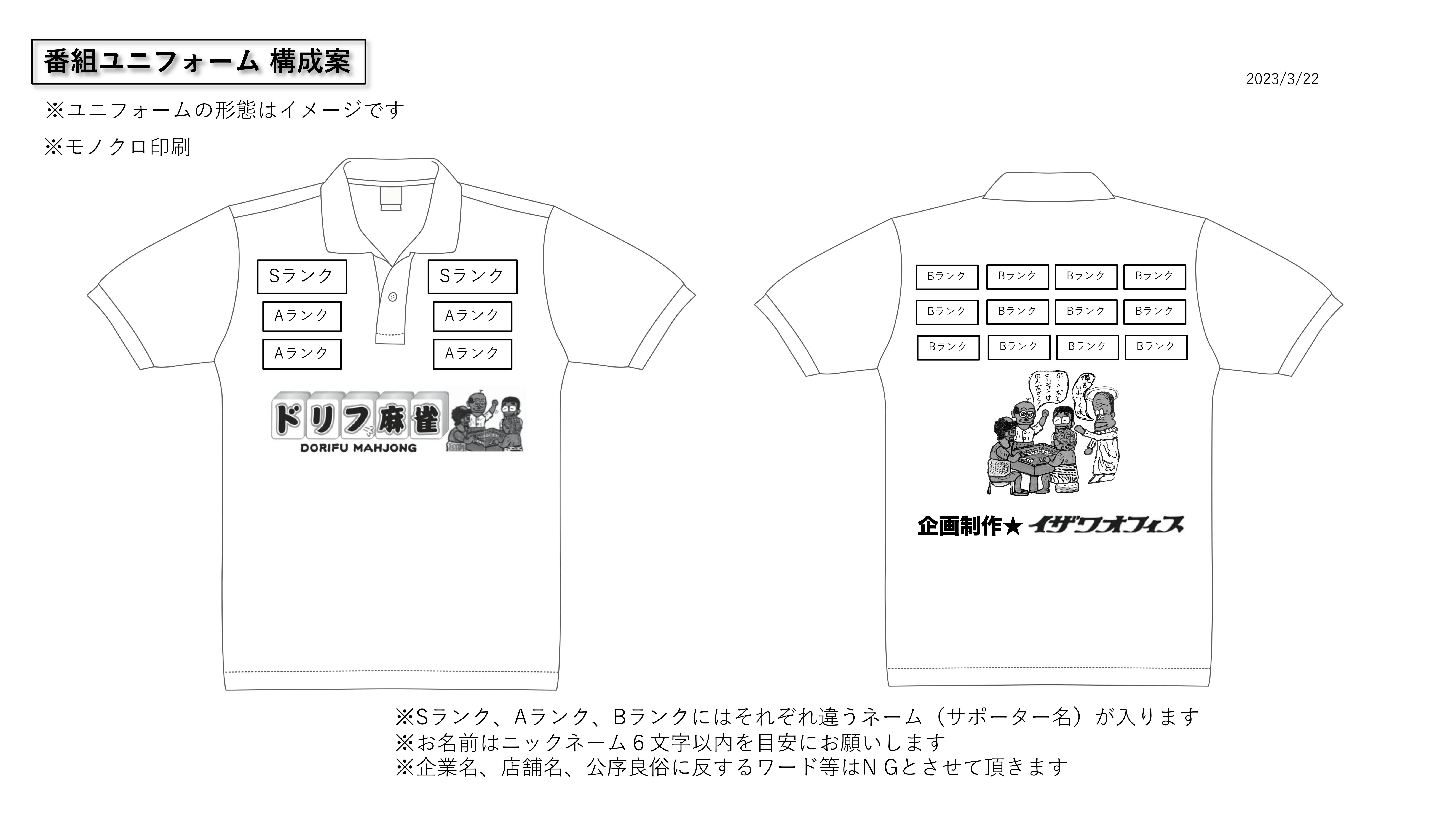 私たちは、サポート頂く皆様とドリフメンバーとの繋がりを視覚的に表現するため、「ドリフ麻雀」動画内で加藤茶と高木ブーが着用する特注ユニフォームを作成しました。私たちがご提案するプランは、主にユニフォームへのお名前の掲出と露出、加藤茶&高木ブーのサイン入りユニフォームのご提供などです。