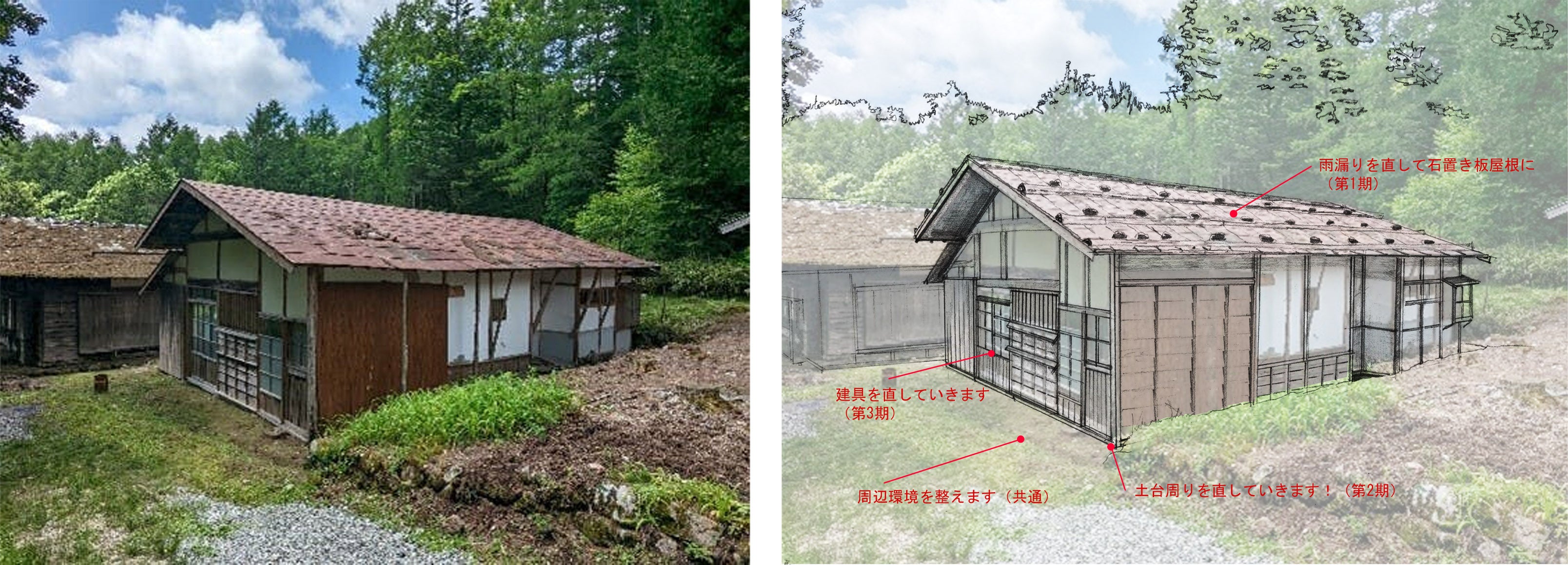 しかし、離村50年を超え、建物修復工事からも30年が経ち、現在では、民家の各所に傷みが増えています。