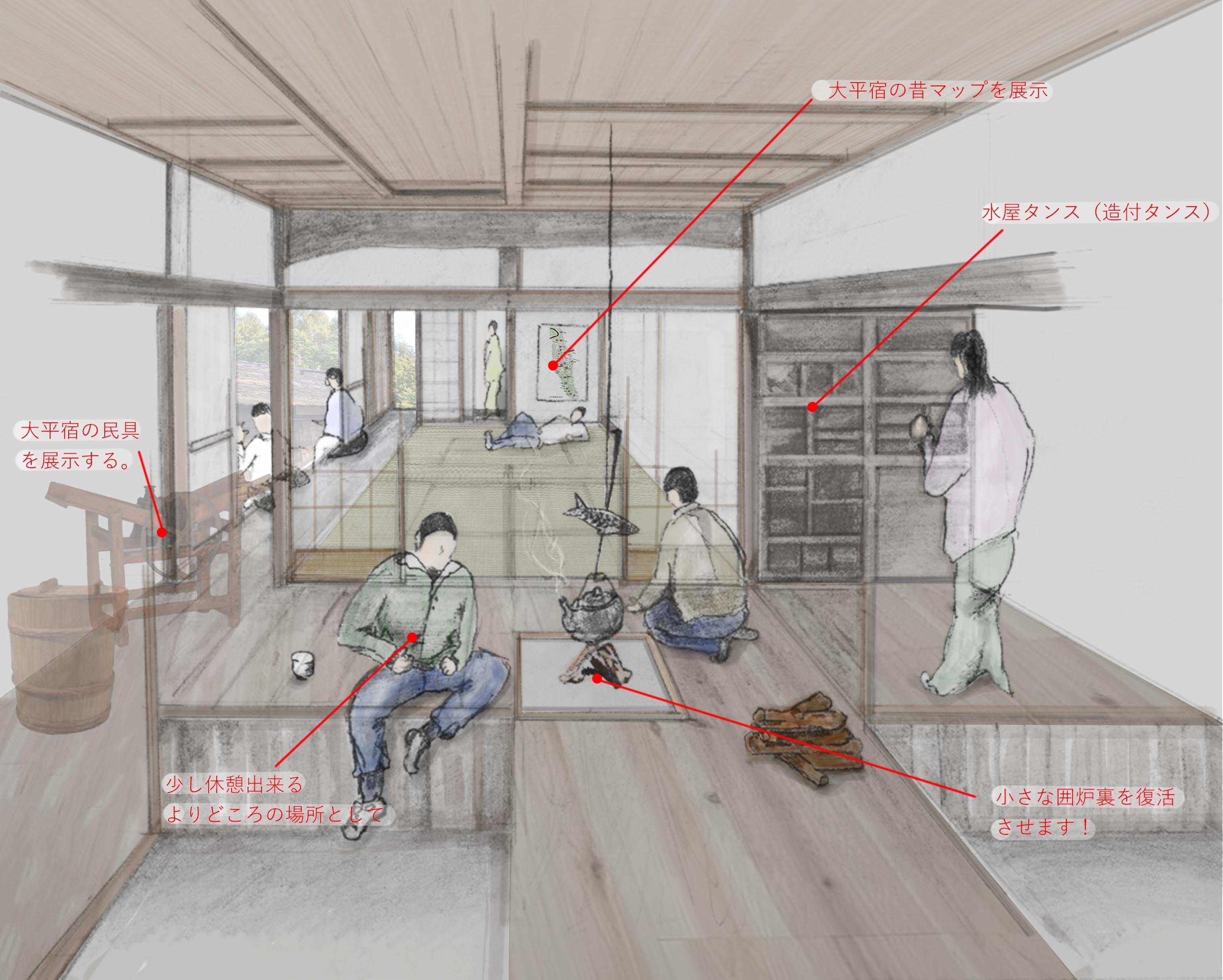 また、これまで収集してきた「大平宿の歴史」や「大平宿の昔話」などを展 示し、訪れた方には囲炉裏でお茶を出したり、ゆっくりくつろいでいただけ る場所にしたいと考えています。