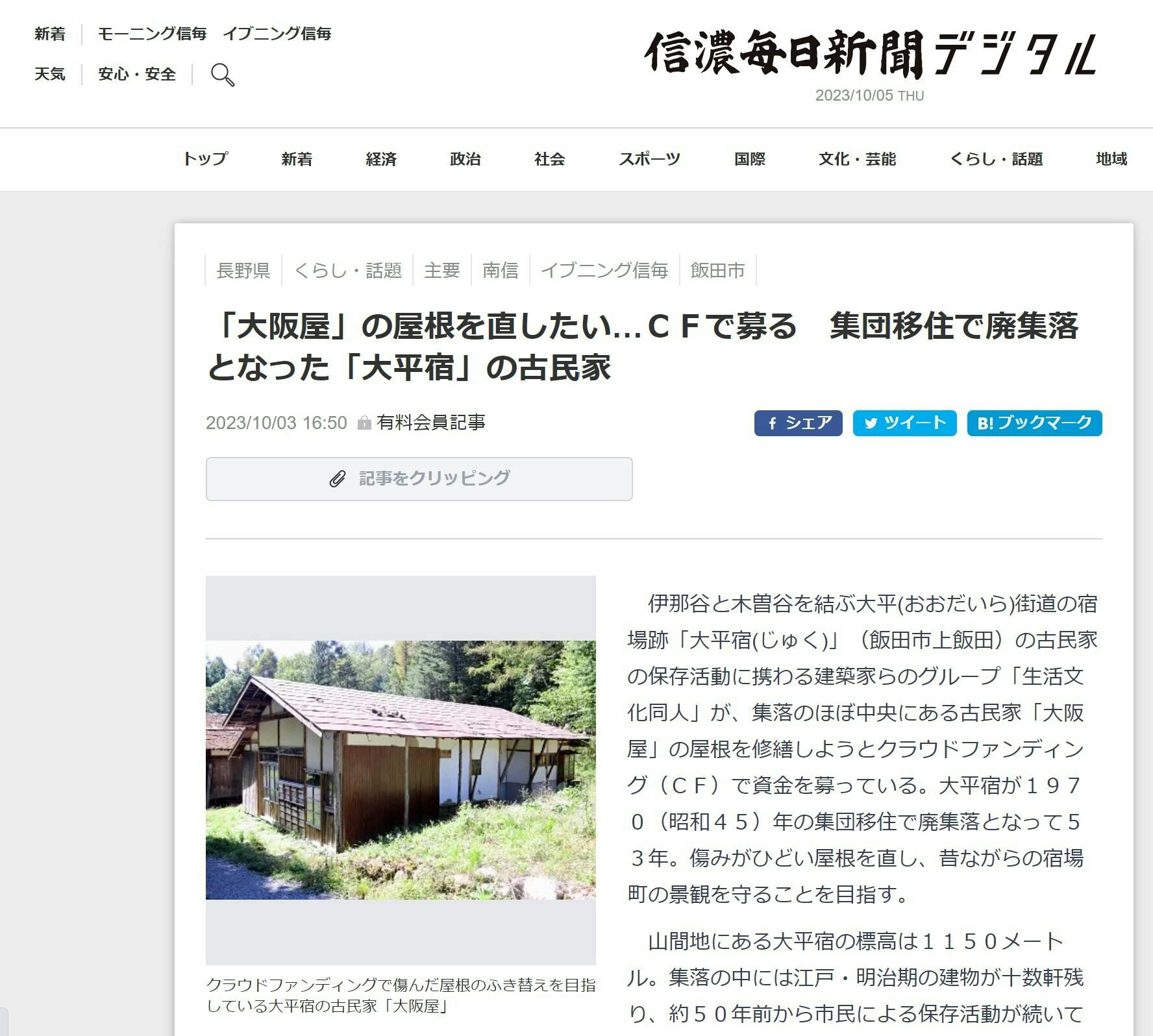 2023/10/07 11:11「50年前に離村した集落を次の50年に繋げたい!“大阪屋”の再生プロジェクト」実行委員長 宮内です。我々の挑戦も、残り12時間余りとなりました。ここまで支えてくださった、皆様のおかげで無事達成をすることが出来ました。改めまして、御礼も申し上げます。本当にありがとうございました。今回ご支援いただいた資金をもとに、大阪屋改修計画(まずは屋根から)を進めていき、それで得られた知見や見解は、飯田市や大平宿に関わられる方々へ広く周知し、開けた集落保全に繋げてまいります。今回を期に、今後も何卒我々の活動と大平宿をご注目頂けたらと思います。next ゴールもあと少しで達成です。最後の最後まで達成に向け頑張ります。大平宿についても、なるべく大勢の方に知ってもらえたらとても幸せです。この活動に注目された方、ご友人や親しい方々に少しでも大平宿のことを話してくれたらうれしいです。よろしくお願いします。実行委員長 宮内 もっと見る
