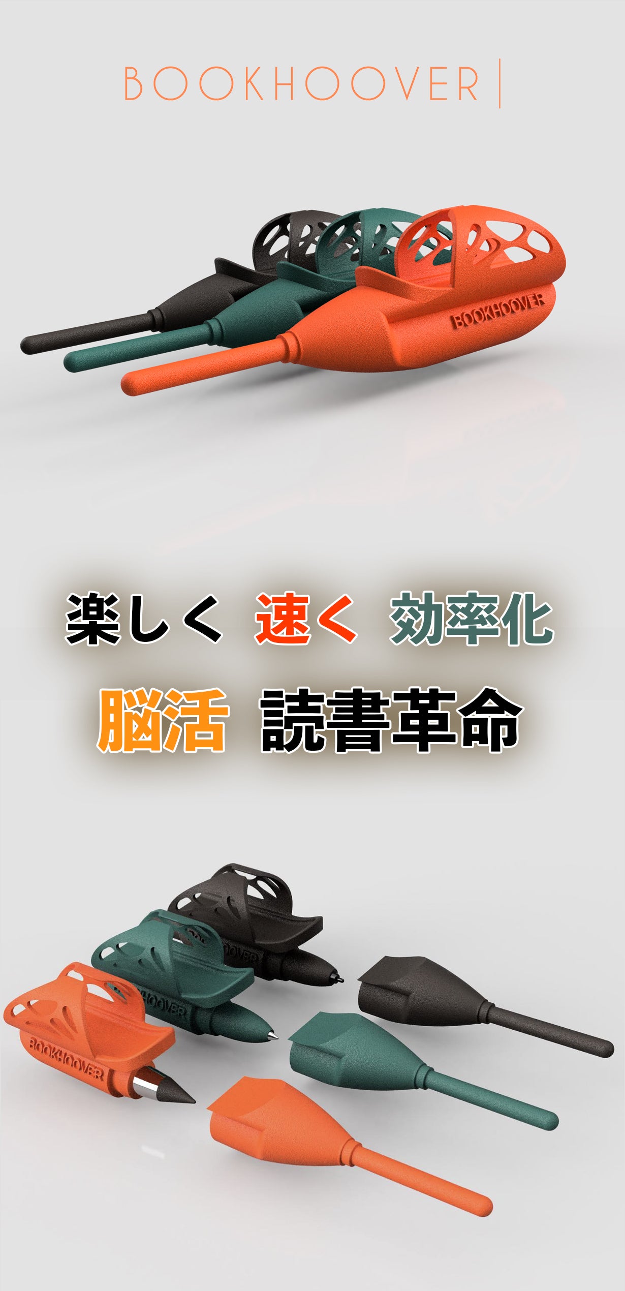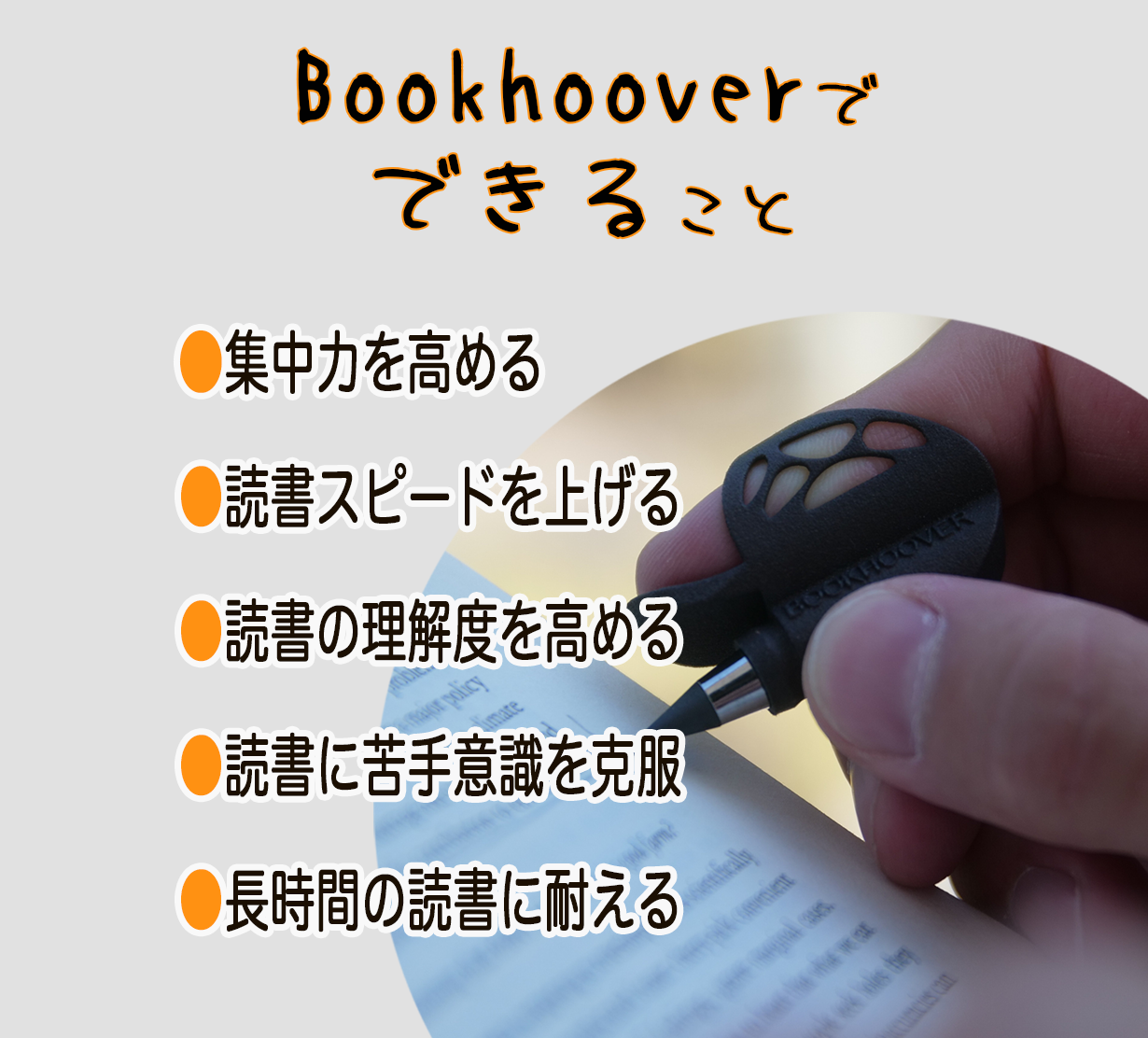 『Bookhoover』は指読の補助として設計されており、指先で文章を追うことで注意力を集中できます。集中力を高めることで、読書がより効率的に。