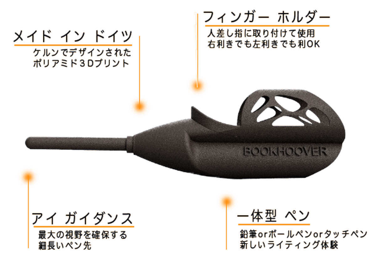 『Bookhoover』は指先が長く、一体型のペンを備えているため、文章を追うスピードが速くなります。指読を補助することで、読書スピードアップに貢献。