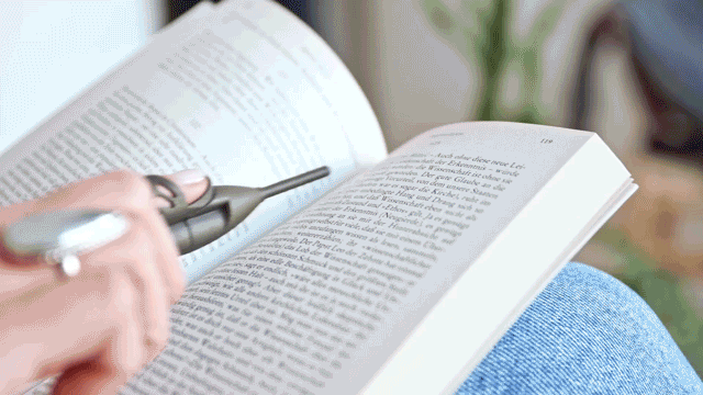 『Bookhoover』は軽量で小型デバイスであるため、長時間の読書にも。また、指先で文章を追うことで、疲れにくくなり長時間の読書に適しています。