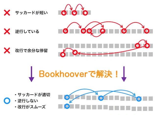 文章を読む時の目は、実はテキスト全体をスムーズに移動しているわけではなく、瞬時に単語から単語へと凝視とジャンプを繰り返し(サッカード)、ときに単語間を逆行をしながら文章認識を行っています。