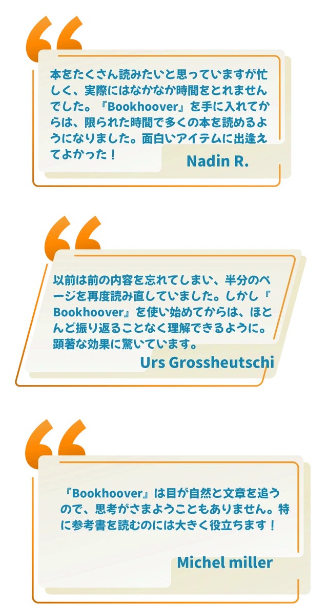 ◉読書好き:時間がなくて本を読む機会が少ない人や、本を読むのが苦手で時間がかかる人にとって『Bookhoover』は理想的なツールです。『Bookhoover』を使うことで、より多くの本を短時間で読みやすくなります。
