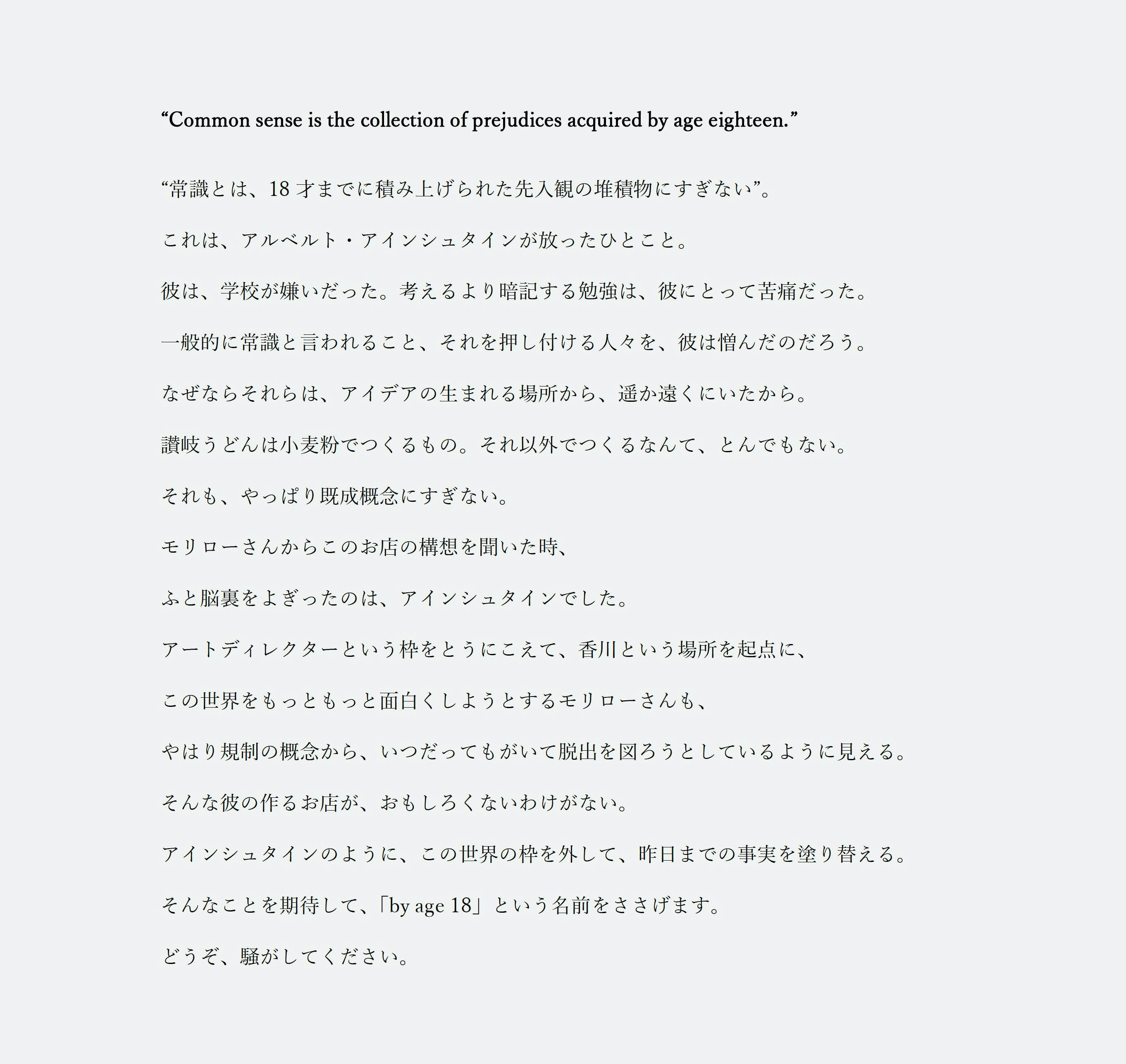 そうして決まった店名は「by age 18(バイエージエイティーン)」。アインシュタインの名言「Common sense is the collection of prejudices acquired by age 18.(常識とは、18才までに積み上げられた先入観の堆積物にすぎない。)」という文言から発想されたネーミングです。