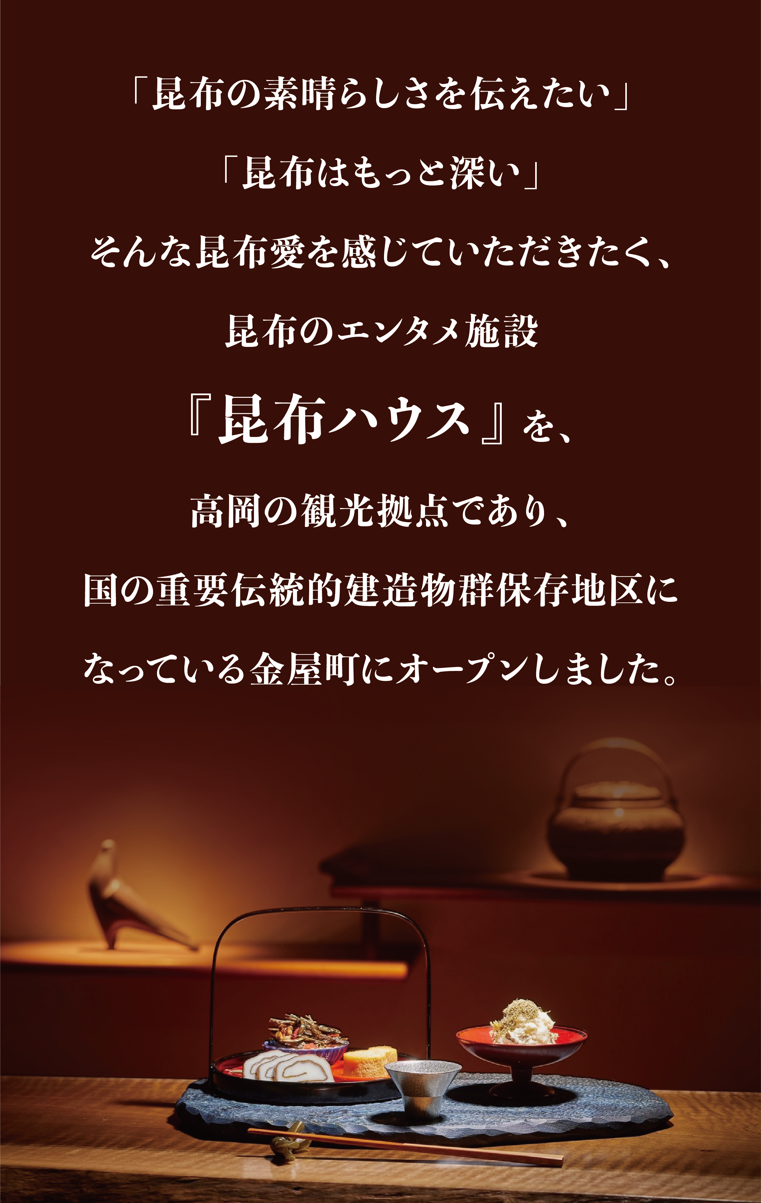 地元・高岡市の観光産業の振興と共に、日本が誇る「昆布の食文化」を発信する施設を目指しています。