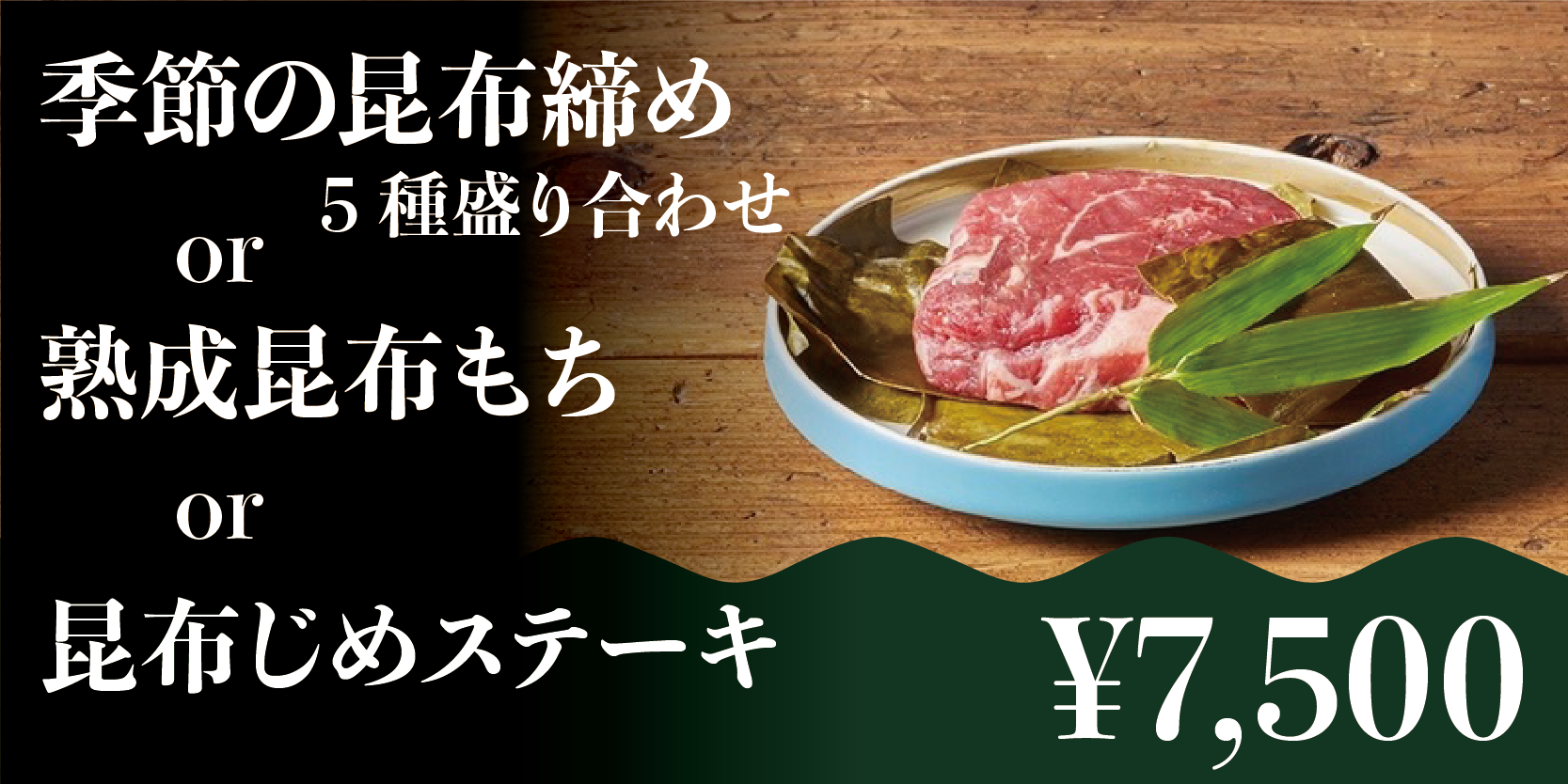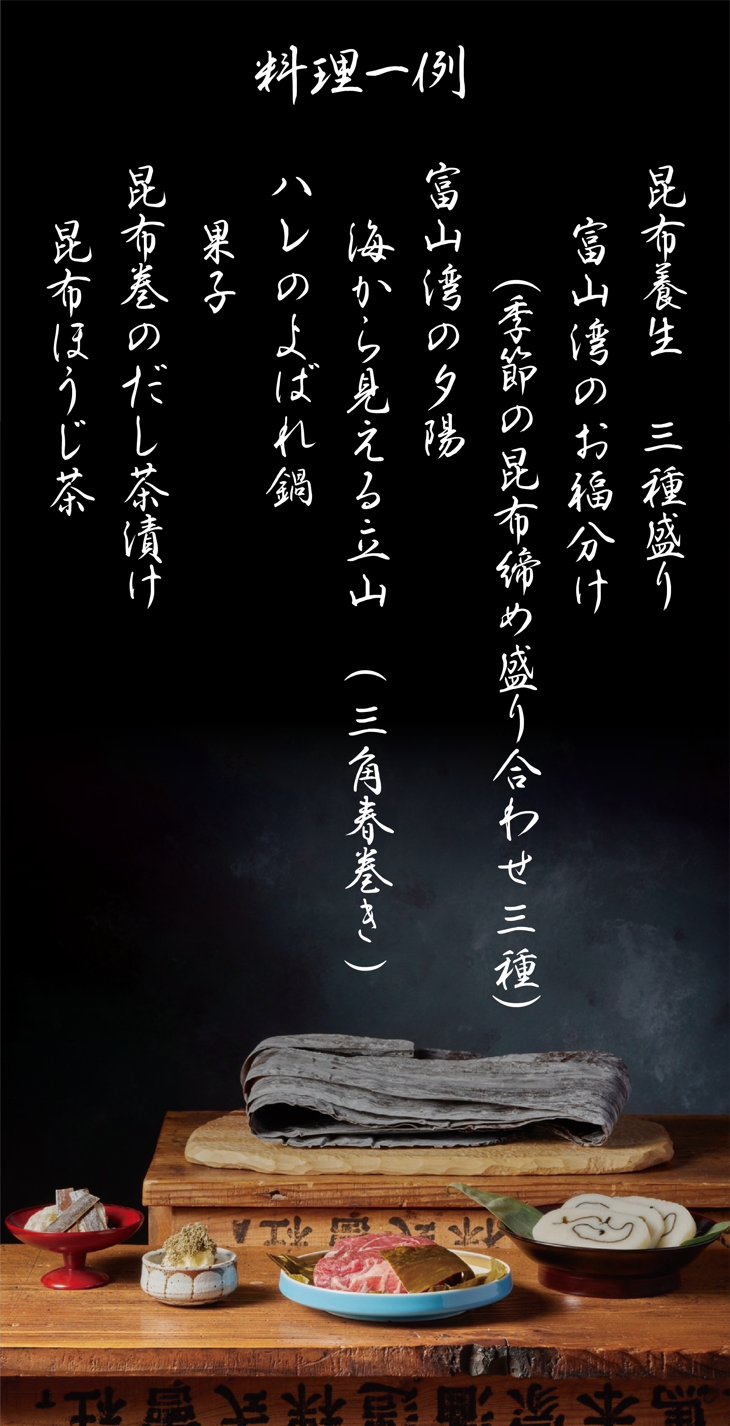 お食事は併設の昆布BARにてお楽しみいただきます。コース以外にも、単品メニューもご用意しています。
