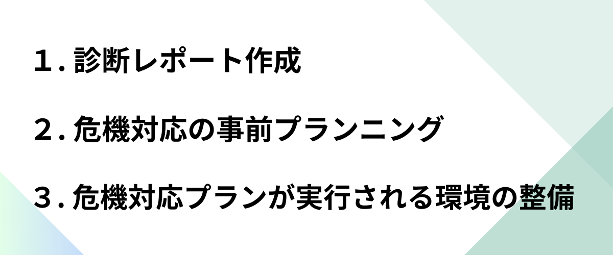 診断レポートに基づき、事業を継続していくために何をすべきなのか、どのような体制にして誰が何をするのか、というプランを立て、行動マニュアルを策定していきます。
