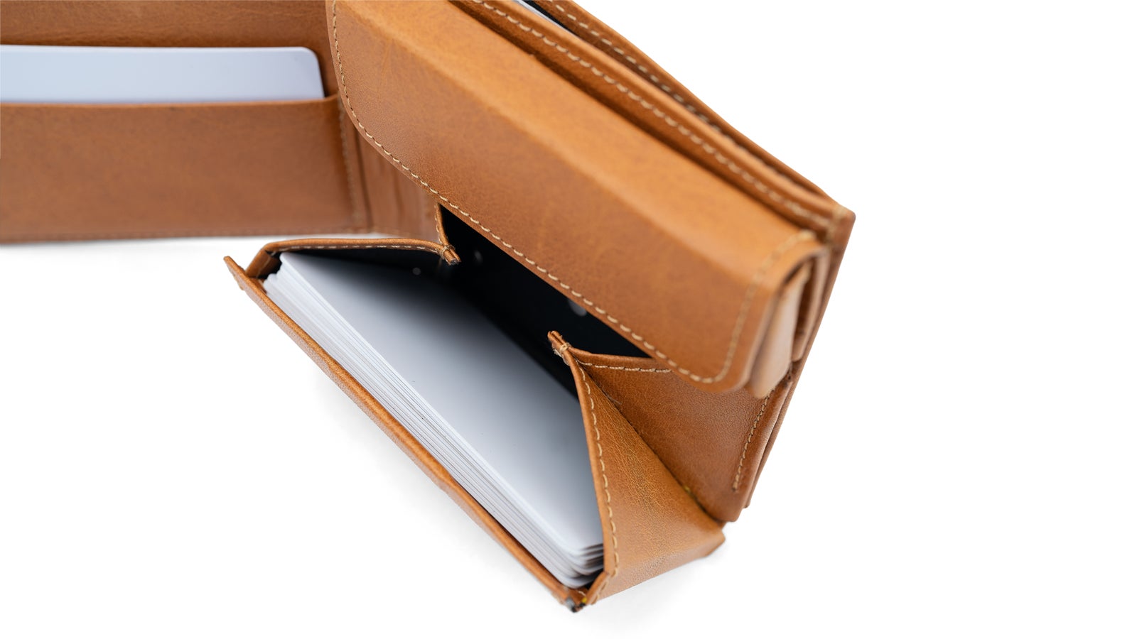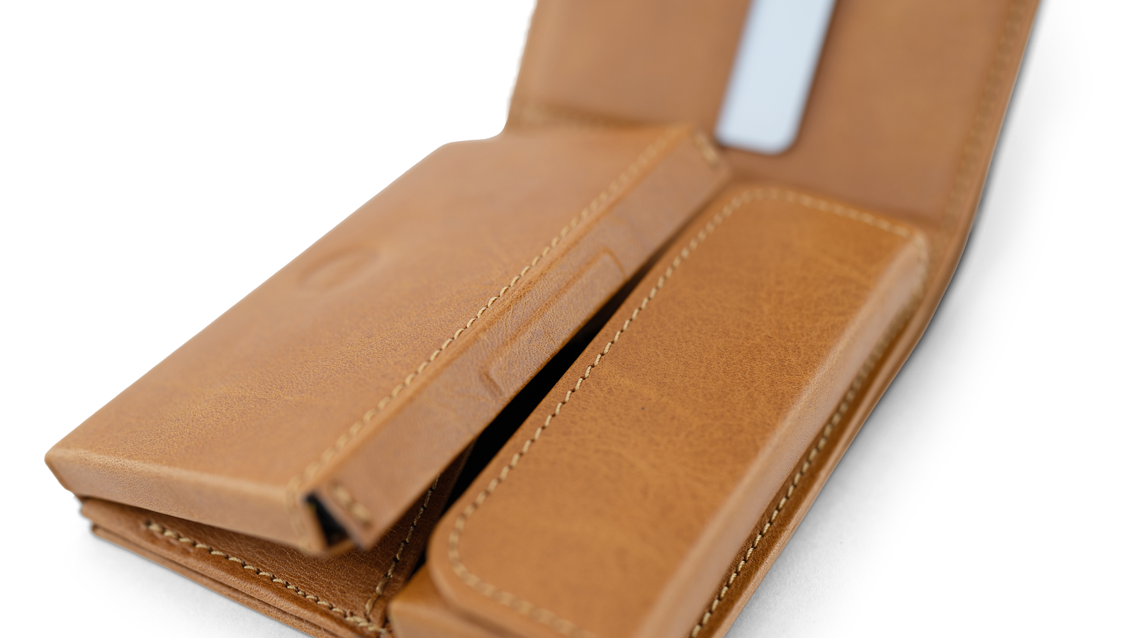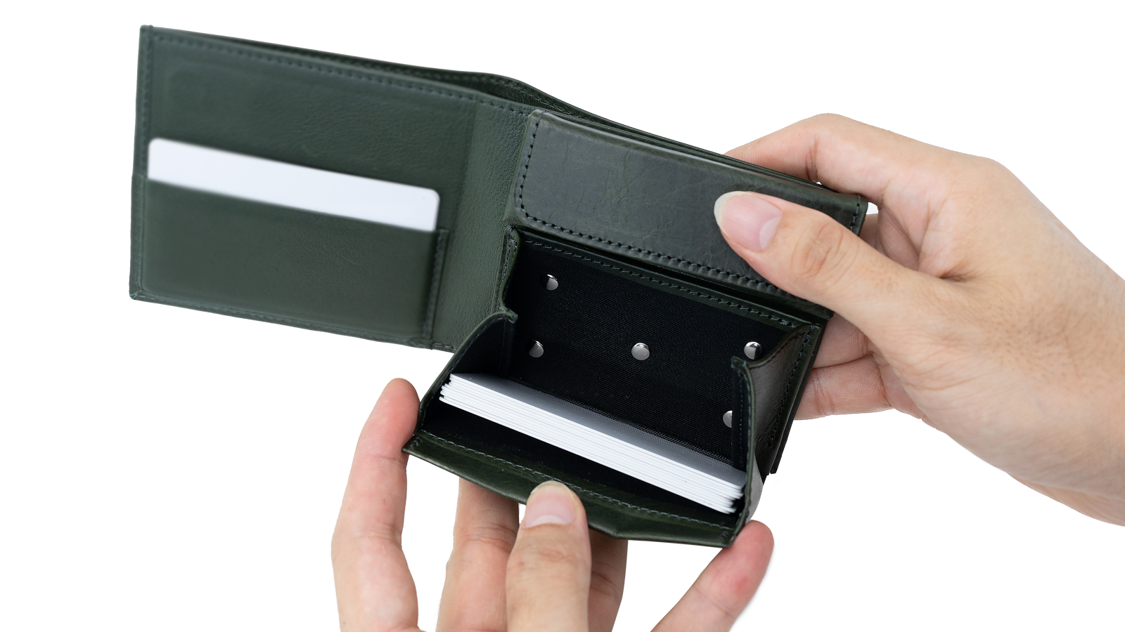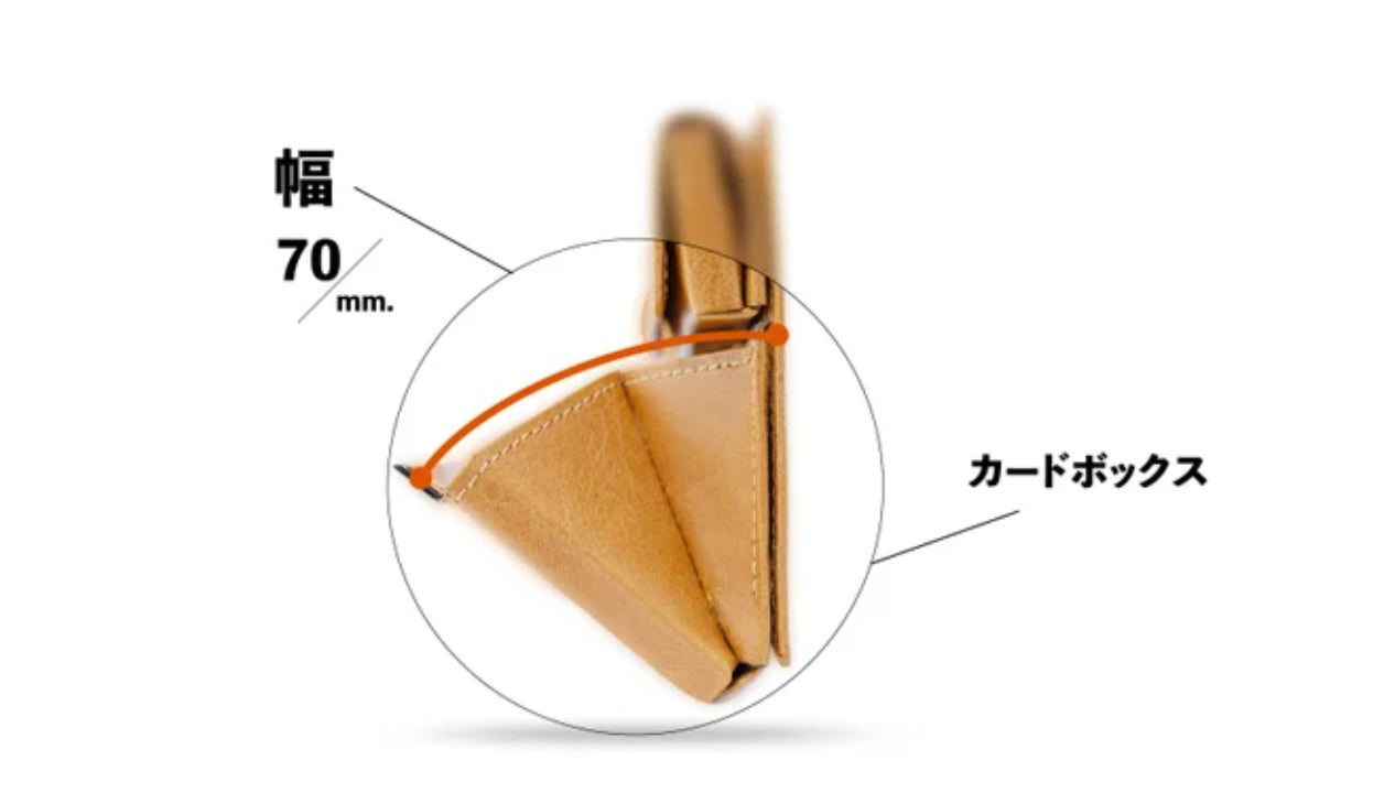 各配置を考慮して、財布を畳んだ後にポケット側のカードと硬貨ボックスが重ならない設計となっています。