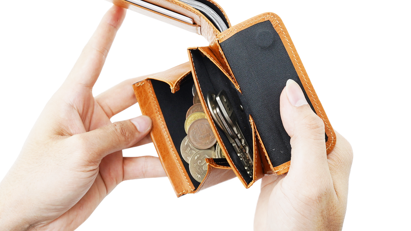 【硬貨BOX】【カードBOX】【カードポケット】それぞれが干渉しないため、一定の収納力を保ちながら全体の厚みを抑えることに成功。また、シンプル設計で余計な収納は排除したため、日頃の財布の中身の整理整頓にも繋がるデザインとなっております。