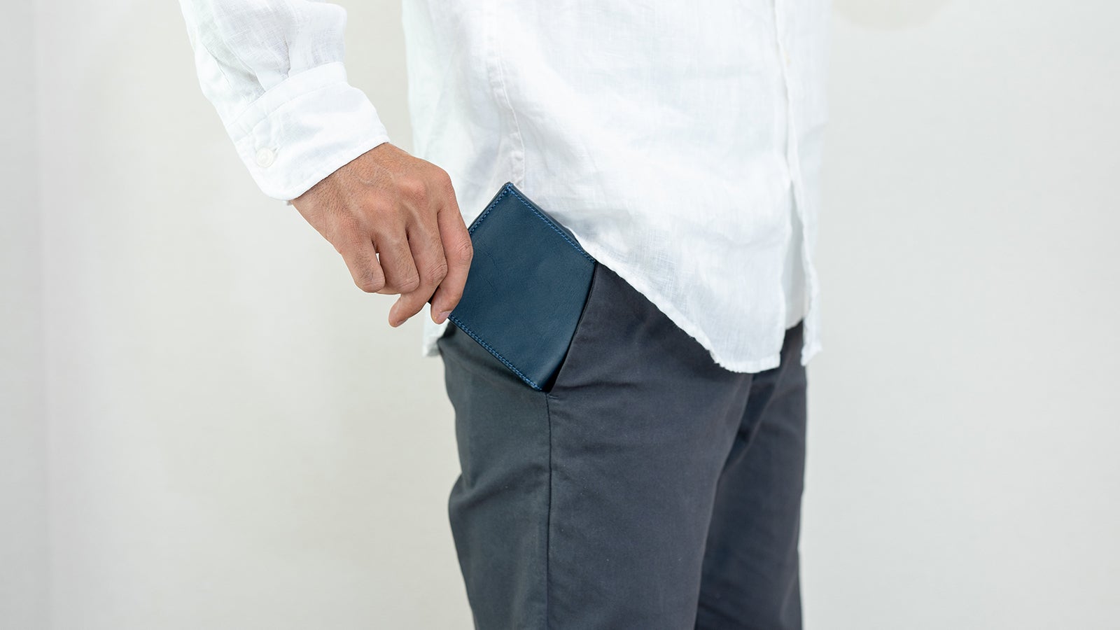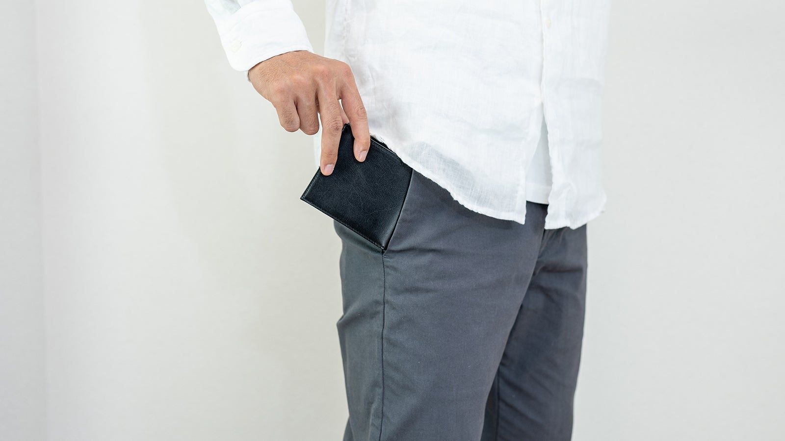 ズボンの後ろポケットに入れる時も同様にお尻の片側だけがボコッと飛び出てしまうことを防ぐよう厚みを抑えております。