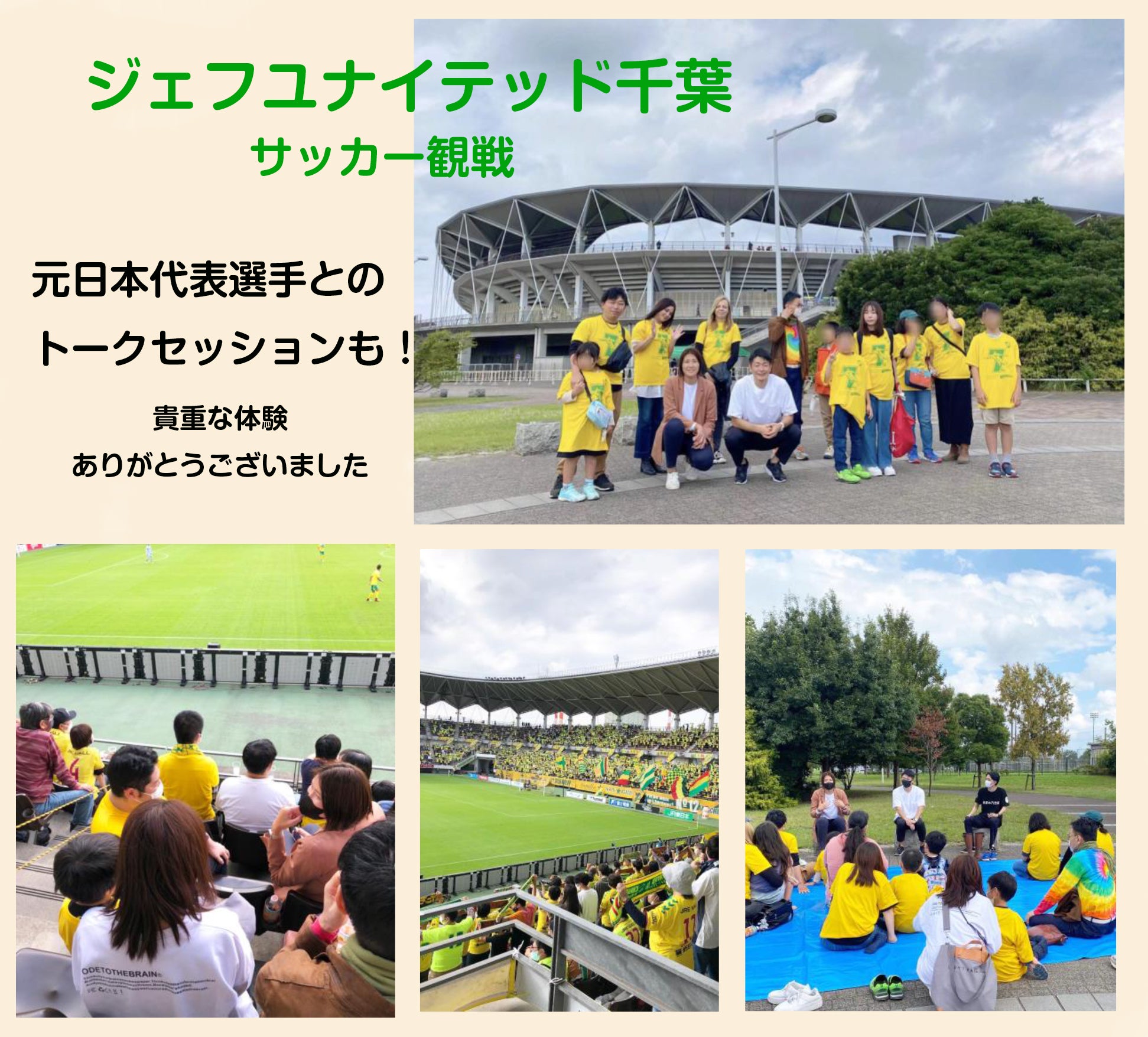 ひとり親家庭の親子さん対象のサッカー観戦!佐藤勇人さんからご提供いただいたお揃いの記念Tシャツを着て、元日本代表の方々のお話も聞けて楽しい1日になりました。