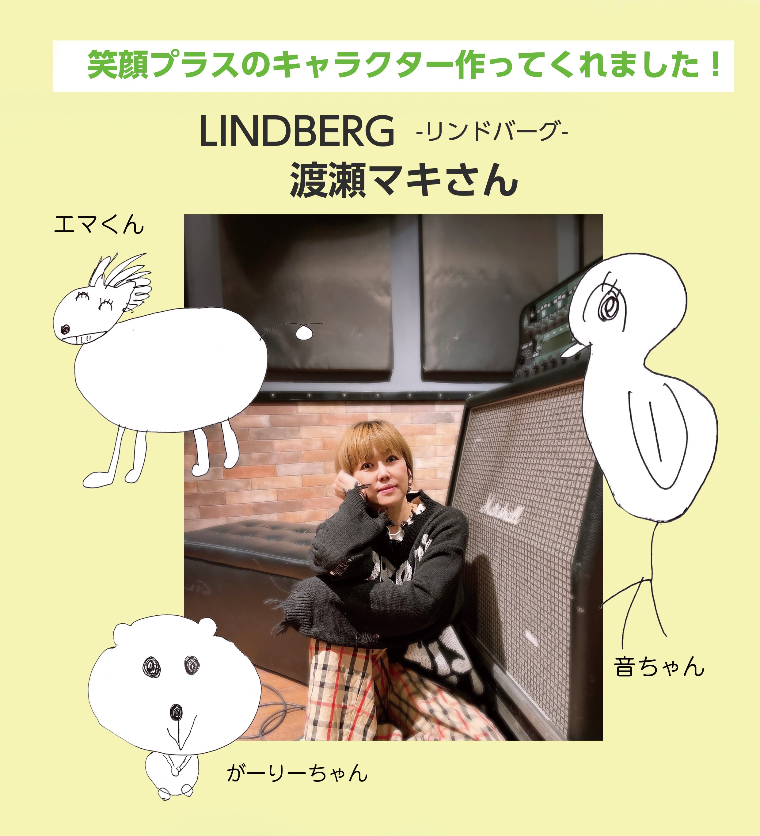 笑顔プラスの活動に賛同してくださる方々です!本当に感謝致します。渡瀬マキさんは不思議で可愛いキャラクターをデザインしてくれました!夏の笑顔イベントでもエマくん・がーりーちゃん・音ちゃんが活躍してくれるでしょう!