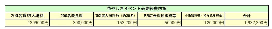 200名をご招待した場合のイベント必要費用内訳です。昨年の実地費を参考に致しました。