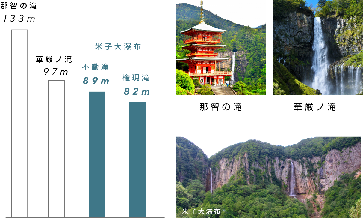 日本三名瀑"那智の滝"と"華厳の滝"との落差比較。これだけの落差を誇る2条の滝が同時に楽しめるのは米子大瀑布の魅力です。