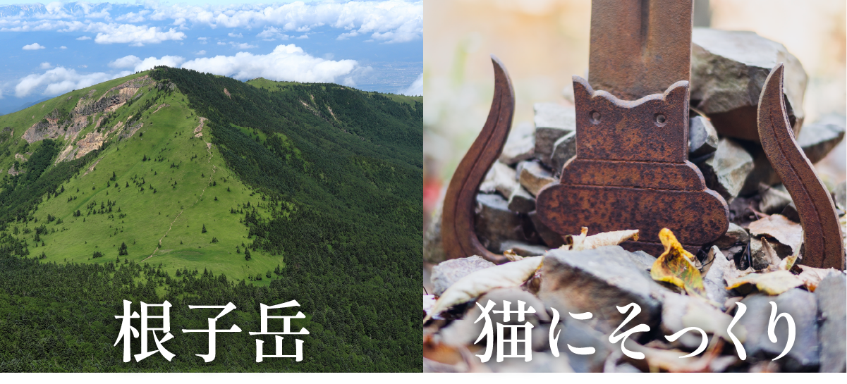 米子大瀑布は古来より信仰の対象となっている四阿山とその外輪山である根子岳(ネコダケ)の麓に位置しています。根子岳とは根っこ、生命の根源に由来とすると言われていますが、現代風に見ると面白いことに山容は猫にそっくりでもあります。さらに不思議なことに不動滝に祀られている倶利伽羅剣(不動明王が右手に持つ剣)の鍔もまた猫にそっくりであり、先人たちのユーモアを感じさます。これにあやかり私達の山小屋を「根子岳山荘」と名付けたいと思います。