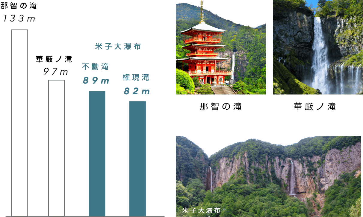 日本三名瀑"那智の滝"と"華厳の滝"との落差比較。これだけの落差を誇る2条の滝が同時に楽しめるのは米子大瀑布の魅力です。
