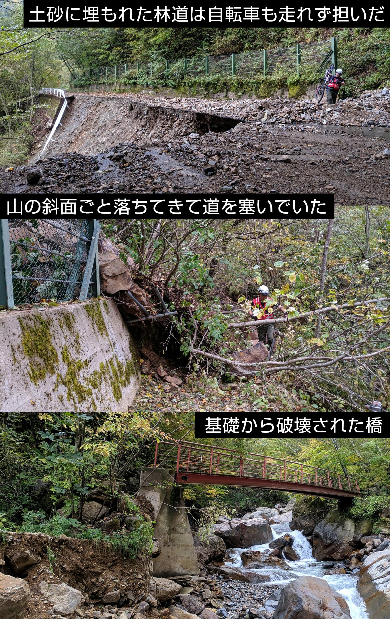 土石流で木々はなぎ倒され、アクセス道路は完全に寸断され、登山道には水が流れ、橋は基礎から破壊され、傾いてしまいました。