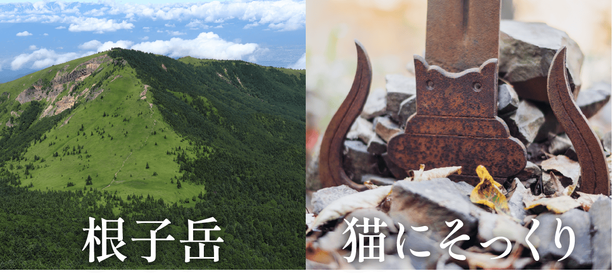 米子大瀑布は古来より信仰の対象となっている四阿山とその外輪山である根子岳(ネコダケ)の麓に位置しています。根子岳とは根っこ、生命の根源に由来とすると言われていますが、現代風に見ると面白いことに山容は猫にそっくりでもあります。さらに不思議なことに不動滝に祀られている倶利伽羅剣(不動明王が右手に持つ剣)の鍔もまた猫にそっくりであり、先人たちのユーモアを感じさます。これにあやかり私達の山小屋を「根子岳山荘」と名付けたいと思います。